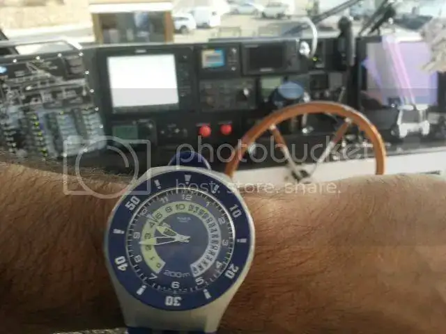 Antes de salir de puerto, me enseñaron el cuadro de mandos del barco, y mi Swatch no se quiso perder el momento.