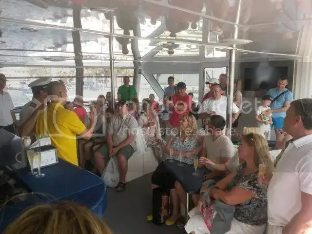 A los atunes se va en este gran catamarán (19 metros), muy estable y perfectamente preparado para que los turistas puedan cambiarse, ver unos vídeos informativos y tomar una copa de cava durante el viaje. A la vuelta, los que quieren también pueden tomar un poco de shushi de atún.