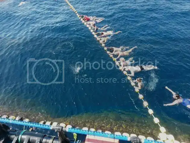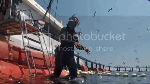 Uno a uno, agarrados a la corchera, viendo los atunes debajo de ellos. Estos, como eran rusos, se tiraron al agua sin traje (no estaba muy fría). Esa salpicadura que se ve a la izquierda es una caballa que tiraban desde el barco, para hacer que subiera algún atún
