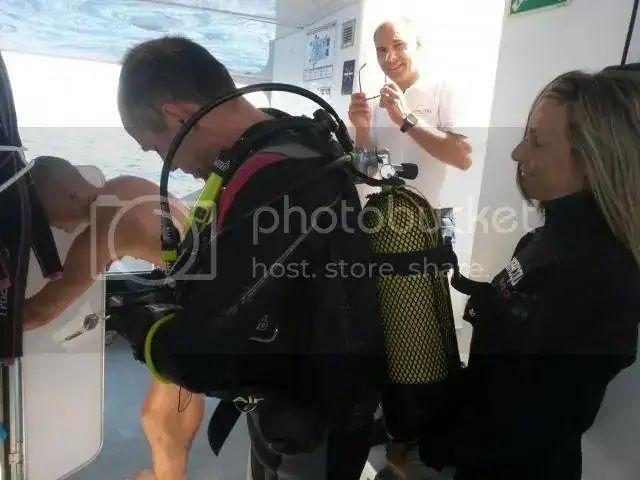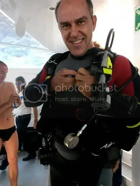 Acabando de ajustar el equipo. Podeis ver (sólo las correas, porque los llevo girados hacia mi) el ordenador de buceo en mi muñeca izquierda, y el Swatch en la derecha.