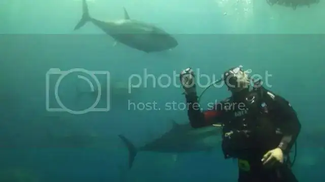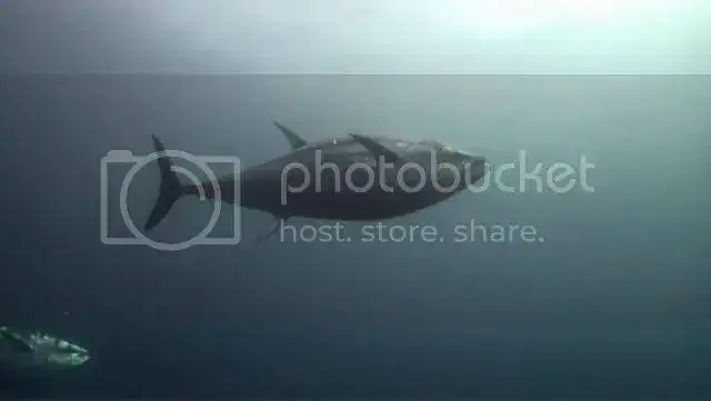 Como ya he dicho antes, a los turistas se les daba algún pescado (ese día eran caballas) para acercar los atunes. Dejaban caer el pez, que se hundía. Cuando este llegaba a la altura de los atunes, el más atrevido lo engullía de un bocado, como el que se ve en esta foto. Este pasó a un metro de mi, y lo hizo a toda velocidad