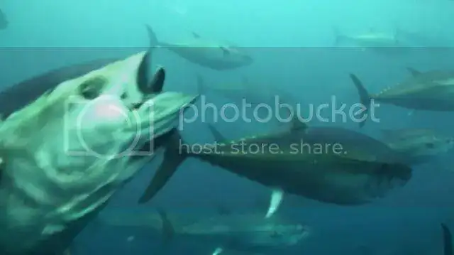 Estos atunes eran tan grandes como yo. Hay unos 400 en cada red (eso dicen, aunque a mi me pareció que había menos), y pesan una media de 250kg. Realmente no dan ningún miedo. Son como pequeños coches que pasan a tu lado, pero no te hacen mucho caso