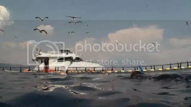 Aqui se pueden ver tres redes donde estabn los atunes. Tienen unos 50 metros de diámetro y llegan hasta 23 metros de profundidad (el fondo está a unos 35). En la primera han instalado dos corcheras para que los bañistas puedan agarrarse y contemplar los atunes, que nadan en círculos debajo de ellos.