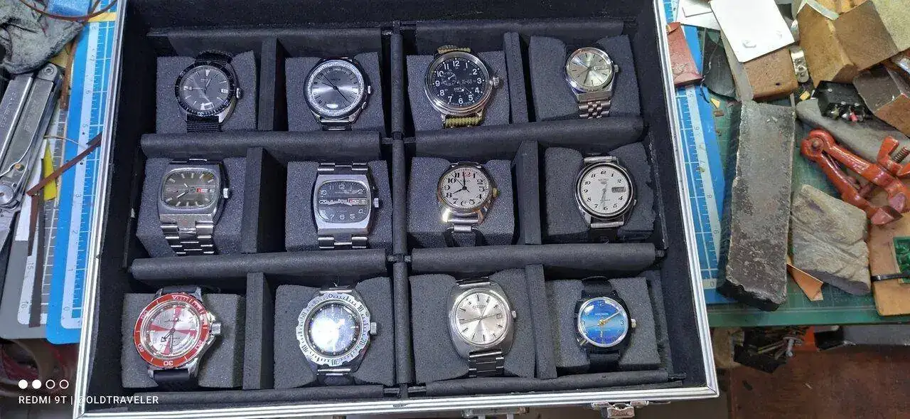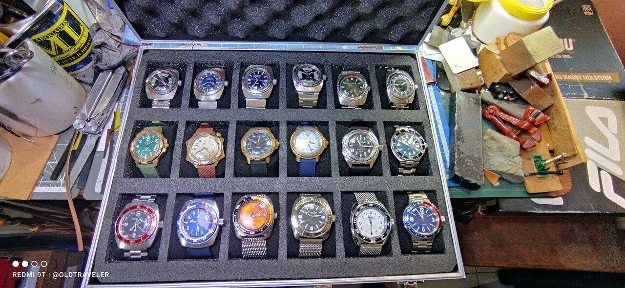 En el maletin, estan alojados, los 119, los 090, los 710 y mis Komandirskie de laton, el maletin, me parece bastante bien para su precio, las divisiones estan hechas con espuma y tiene unos cojines a la medida del hueco y permite alojar comodamente 18 piezas, yo no lo usaria para transporte, pero para mis propositos me va perfecto. pues ocupa poco espacio y tengo facil acceso a los relojes.