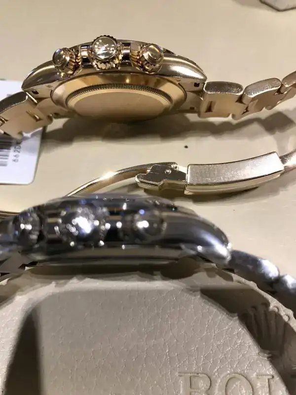 Volvemos a lo mismo, al ojo no entrenado, o pero aún, una pátina oscura por el tiempo en el Daytona de oro amarillo podría hacer que se confundieran mínimamente ambos metales, amarillo y rosa. Para evitar confusiones el de oro rosa ha de llevar la caja simétrica y el de oro amarillo la caja clásica. Cero confusión.