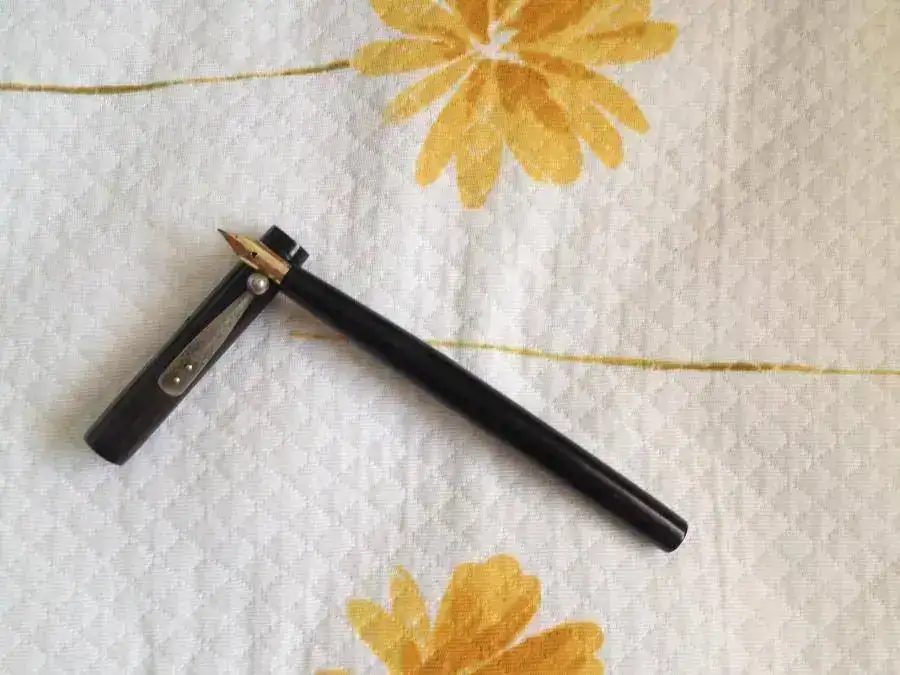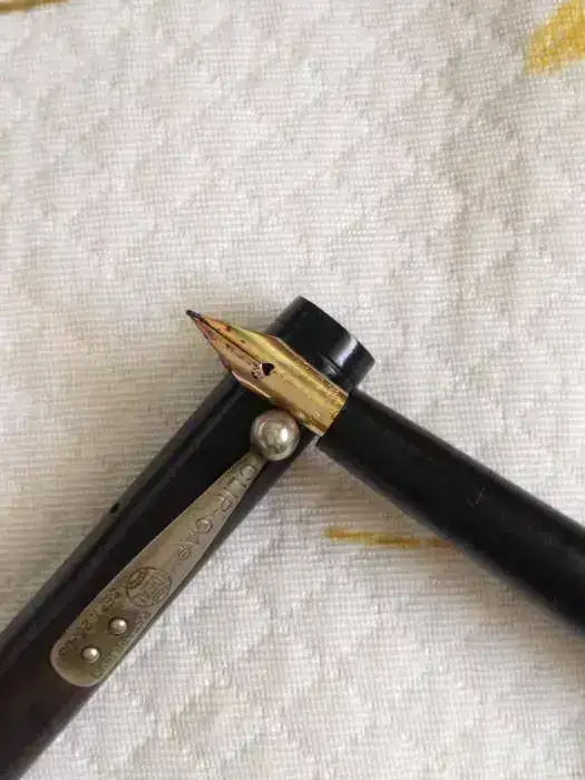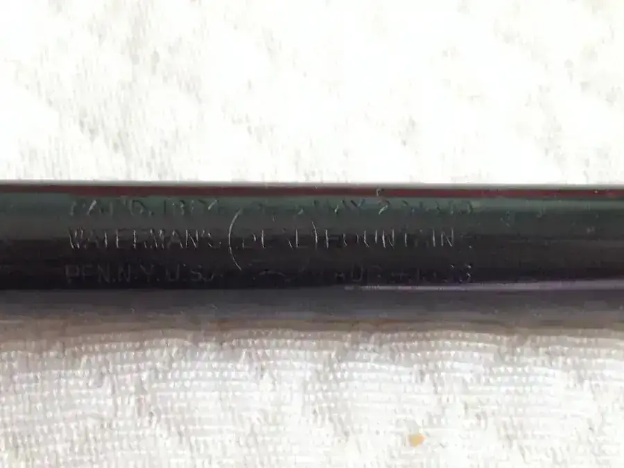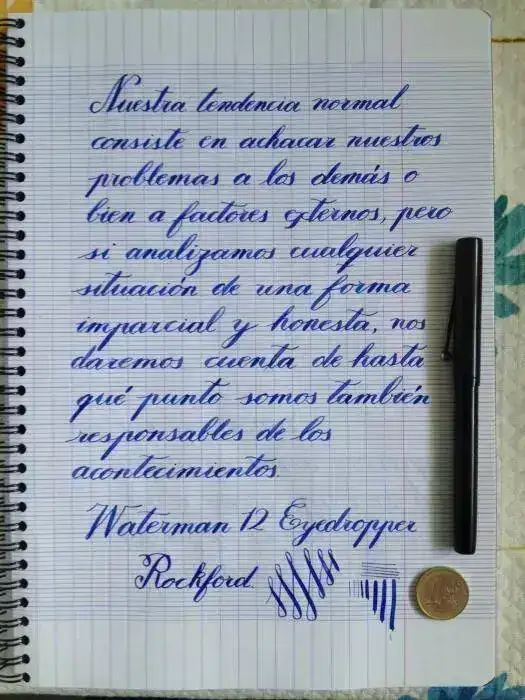 Se trata de una Waterman 12 Eyedropper de principios de 1900, es black hard rubber con el cuerpo liso y a pesar de los años se puede distinguir bien las inscripciones. El plumín es el archiconocido IDEAL Nº2 (mis preferidos), aunque con su terminación más artística un poco curvo hacia abajo. Es flexible sin llegar a ser wet noodle, y tiene bastante diferencia de trazo, de F a BB diría yo.