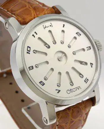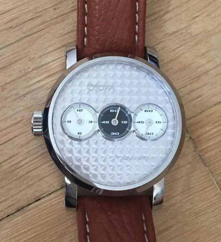 OTIUM Watches. Empresa alemana creada en 1999 por Dirk Hillgruber. Este innovador diseñador de relojes inventa nuevas formas de mostrar la hora en cada uno de sus modelos : Regulateur, Sphaera y Dui. Basandose en calibre ETA 6497-1 y 6498-1 y con ediciones muy limitadas. Lamentablemente desapareció en 2014, quizás debido en parte a unos precios iniciales excesivos, por encima de 4.000€. Mi unidad es un “Trigulateur Regulator” de 2009, donde la esfera simula el salpicadero de un coche racing , con tres relojes : uno de horas, otro de minutos y otro de segundos, en lugar de los indicadores de velocidad, rpm y temperatura. Caja acero 42mm con corona a la izquierda.