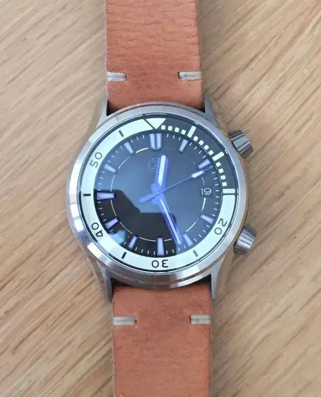 Mi unidad es una actualización que hicieron de su primer modelo, Helmsman 2, limitada a 75 uds., calibre Seiko NH35 y caja acero tipo Super Compressor con doble corona para activar bisel interno giratorio. 300m wr. Viene dotado con correa de cuero y caucho, aunque yo lo tengo ahora con un cuero natural envejecido.