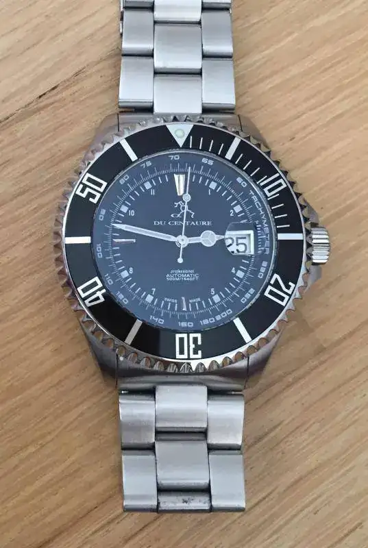 Alpha Du Centaure. No confundir con la marca de réplicas chinas económicas: “Alpha”. Esta es una micromarca suiza creada por dos amantes del mar y de la vela, diseñando y vendiendo desde su web modelos de “regata”. Su diseñador, Fabrizio Cavalca, también músico, diseño el primer reloj de la marca de pianos “Steinway” llamado “Synesthesia” y de la marca “Prano Watches”. Este modelo que presento no es un reloj de regata sino un diseño "Submariner", basado/copia del Rolex Sea Dweller. Eso si con calidad en materiales y acabados, usa un Eta 2824-2, caja 500m de 42mm y válvula de Helio. Incluso el armis de acero incluye extensible para adaptar al neopreno.