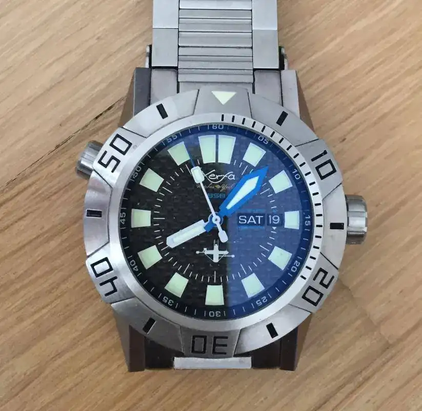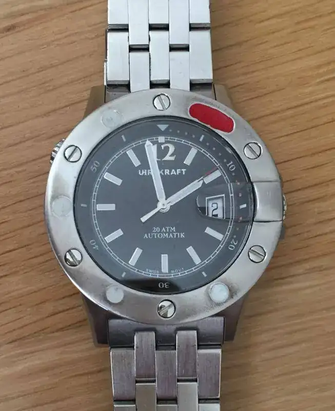 UHR-KRAFT, marca alemana creada en 1999 por Ralf Lehr y Thomas Schörken. Se ha convertido en la relojera más innovadora de su país, todos sus modelos buscan ser especiales y originales, de ahí su eslogan “ Tiempo de ser diferente”. Usan calibres suizos y emplean cajas de gran diámetro. En sus primeros modelos ofrecían hasta 25 años de garantía. De entre estos primeros modelos, su diver se llamó “Canyou 601/2AM”. En una caja de 48mm con doble corona 200m, bisel interno giratorio con corona a las 10h, calibre ETA 2824-2, y un bonito armis de acero con extensión de neopreno. De las 500 uds., esta hace el nº 159, y no lleva el sistema de protección de corona que llevaran las siguientes unidades. Lo que si presenta, y además de forma única, son unas marcas de lumen en el bisel, cuyo acabado es un tanto artesanal/aficionado, pero que le dan un carácter muy especial al reloj.