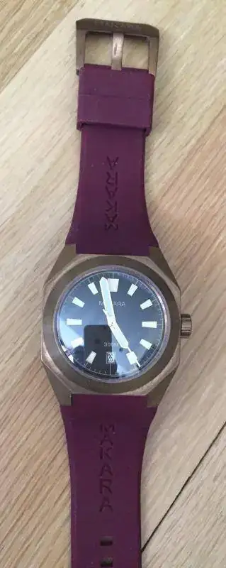 MAKARA, relojera canadiense creada por otro joven : Nadim Elgarhy y también centrada en “diver” con cajas octogonales de bronce y calibre japones. Primer modelo “Octopus con Miyota 9015” y después el “Sea Turtle” con NH35A. Este último es el que os muestro. Caja CuSn8 Bonce, de 44mm acompañada de tres correas, una de cuero envejecido y dos siliconas, negra y burdeos.