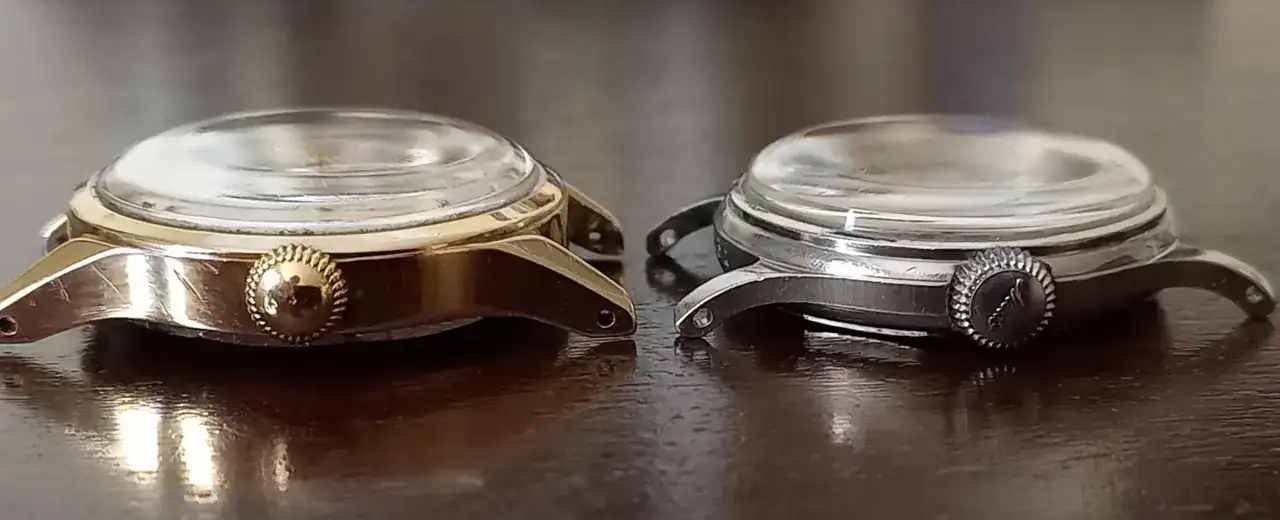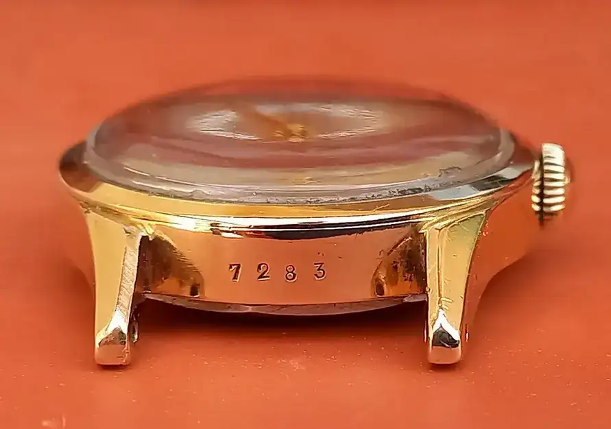 La caja no está chapada en oro, lleva todo lo que es visible con una capa de oro de 80 microns. Con ligeros desperfectos está muy bien. La corona en capa de oro no está firmada, es correcta.