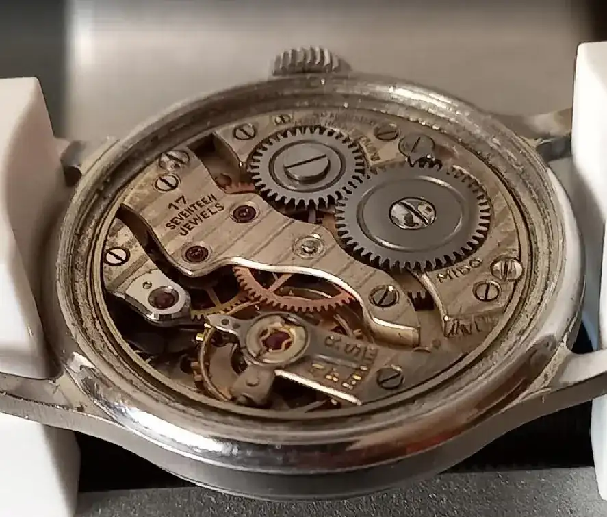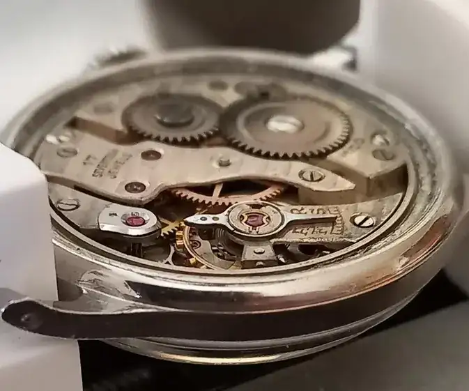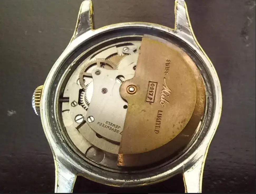 La sorpresa más grande es el movimiento, que aún no tenía número como hoy en día, se llaman Mido 10,5 (líneas francesas). Ancora en oro, réglage con raqueta y no como el de RANFFT con 15 piedras, esta versión lleva 17 rubies, cuatro en la rueda de áncora para eliminar holgura en altura y conservar mejor el aceite. Importante en ruedas que giran rápido.