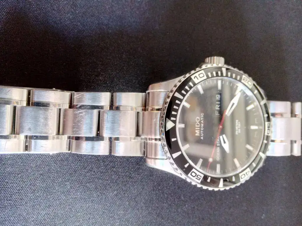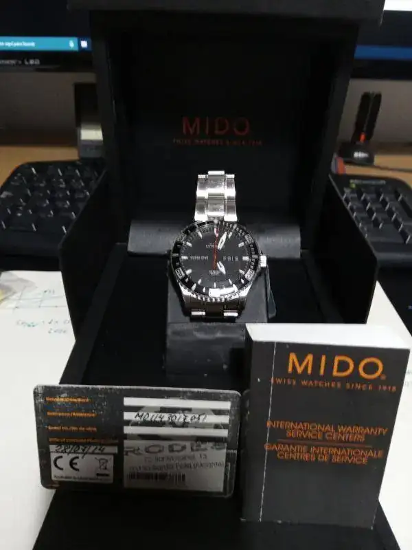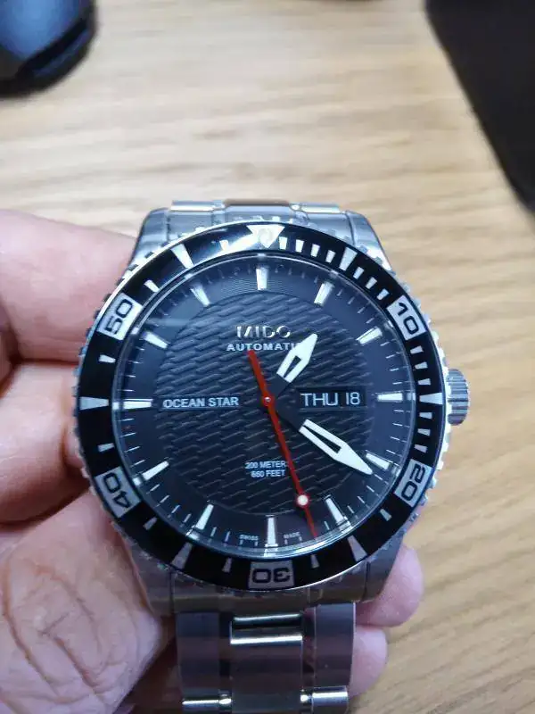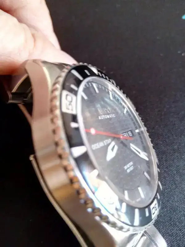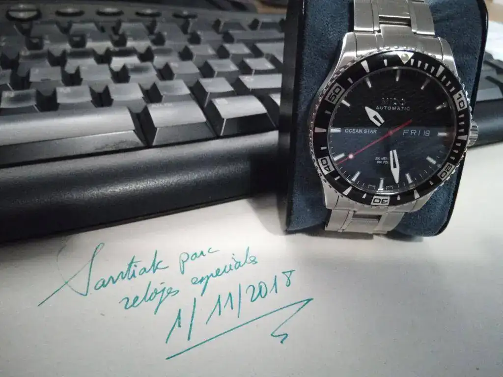 Buenas dias compañeros.Dado que sigo necesitando cash con cierta premura, pongo en venta un MIDO OCEAN STAR CAPTAIN IV, con armis con extensión de buceo original. Yo diría que el reloj está en estado de reestreno, sin marcas en caja, bisel y zafiro, sólo con los inevitables pelos en el armis. De marcha está en parámetros COSC, ya que monta una maquinaria de manufatura G10.211, a partir de una ETA, según datos del fabricante. Tiene fondo visto de cristal mineral, esfera con cristal de zafiro, bisel unidireccional de 60 clics, un lumen azulado molón, sumergible hasta 200 m, dial negro grabado simulando olas, 42,5 mm de diámetro y sólo 11,5 mm de alto, que lo hace muy cómodo con camisas. El armis está ajustado a muñeca de 17,5 cm y sobran eslabones. Se incluye caja original eslabones sobrantes, garantía y manuales.