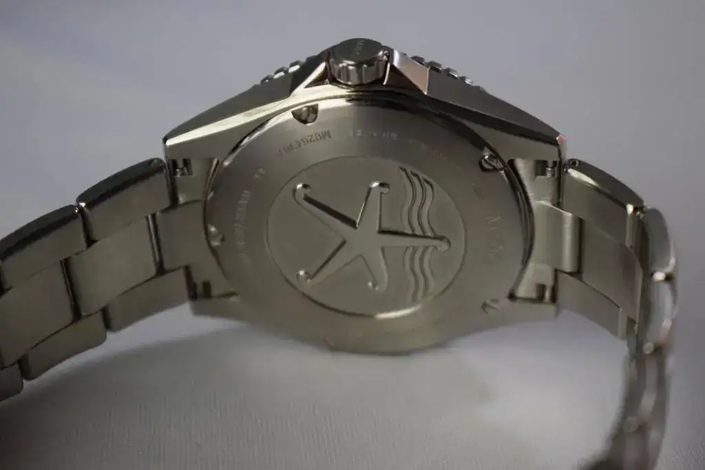Trasera y corona, viene con un diseño de una estrella de mar, hubiera preferido algo mas machote como un tiburón, pulpo o alguna bestia marina pero que se va hacer :pardon:, en cuanto a la corona, pues viene firmada pero el guarda coronas hace incomodo su uso.