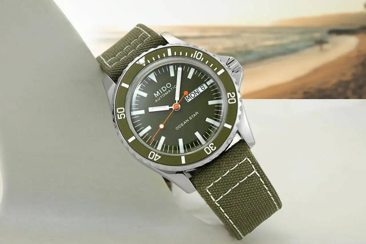 Ahora que están tan de moda los verdes, acabo de ver este Mido en verde con un precioso dial simulando olas y bisel cerámico de color verde también.