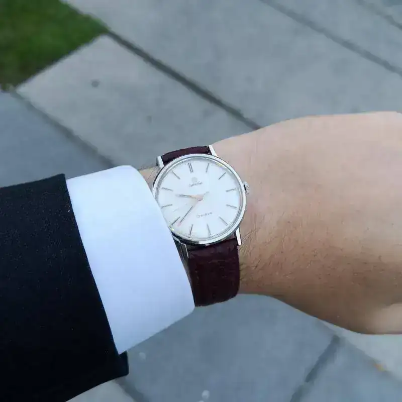 Hoy Omega Genève con calibre 601 de remonte manual, en perfecto estado de forma para tener 50 añitos (circa 1968) y comprado en este foro a un insigne compañero que, si lo ve, se alegrará de comprobar que sigue bien atendido.