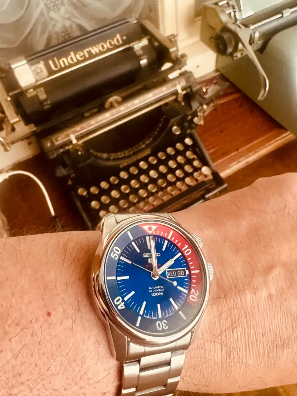 Bueno, es uno de mis Seiko preferidos. Me gustan los relojes humildes como este y que entregan mucha alegría personal. Lo de la máquina es sólo un escenario para que no quede el reloj muy rancio. Muchísimas gracias Fernando y muy feliz noche.Amigo Raúl, creo que no había visto antes ese modelo de Seiko y me parece muy bonito con sus colores y con esa configuración de bisel interno y doble corona... bravo. Sin embargo, y como me ocurre con muchas de tus fotografías, rápidamente fijo mi atención en esa Underwood que tienes de fondo