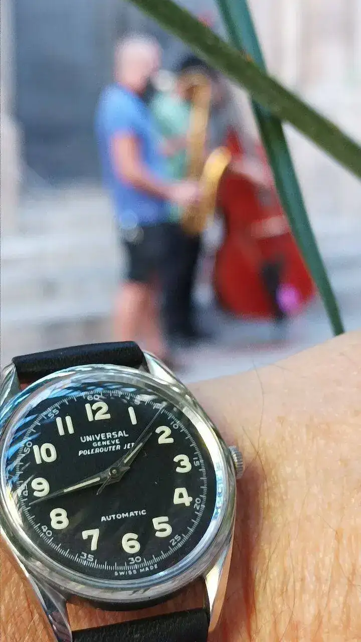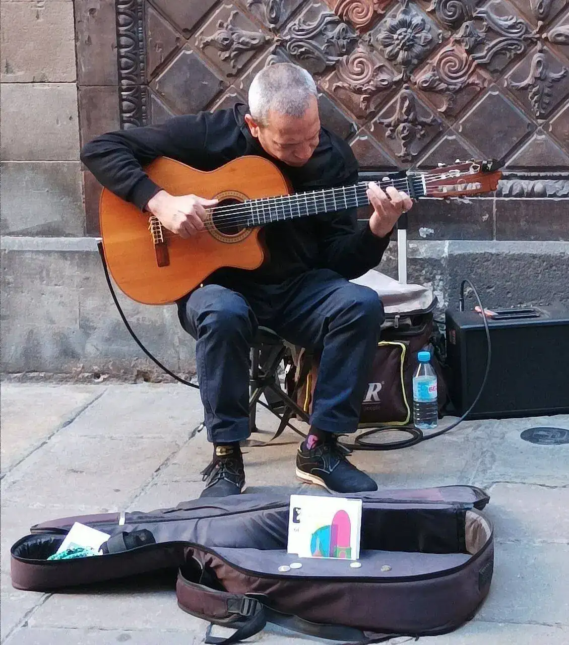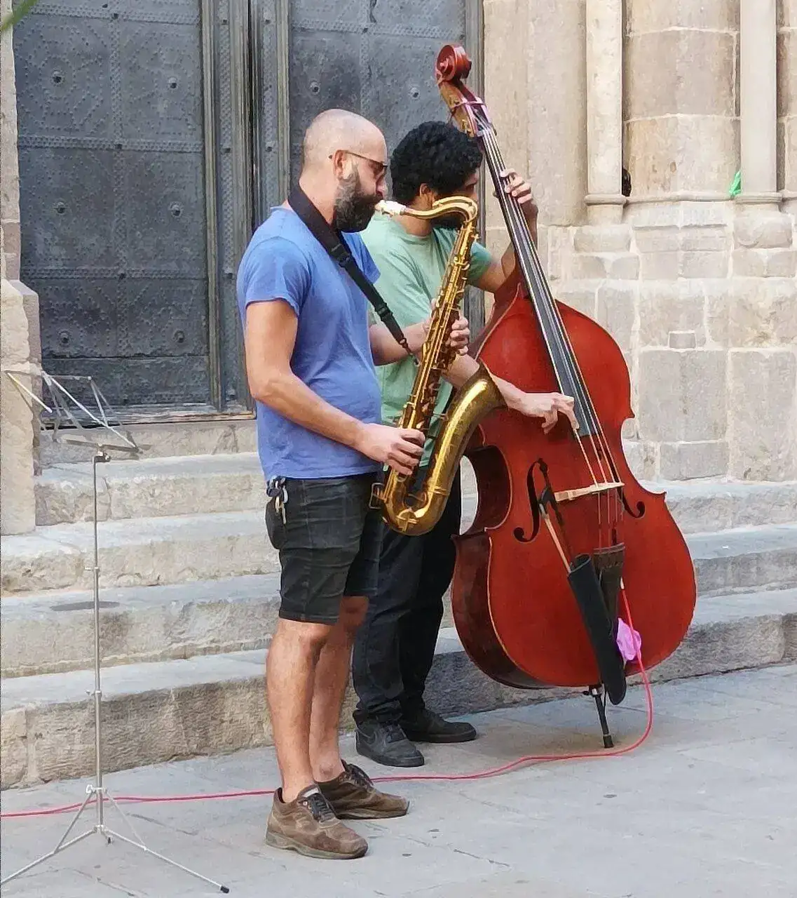 Escuchando buena música, con el recien llegado por el barrio gótico de Barcelona...