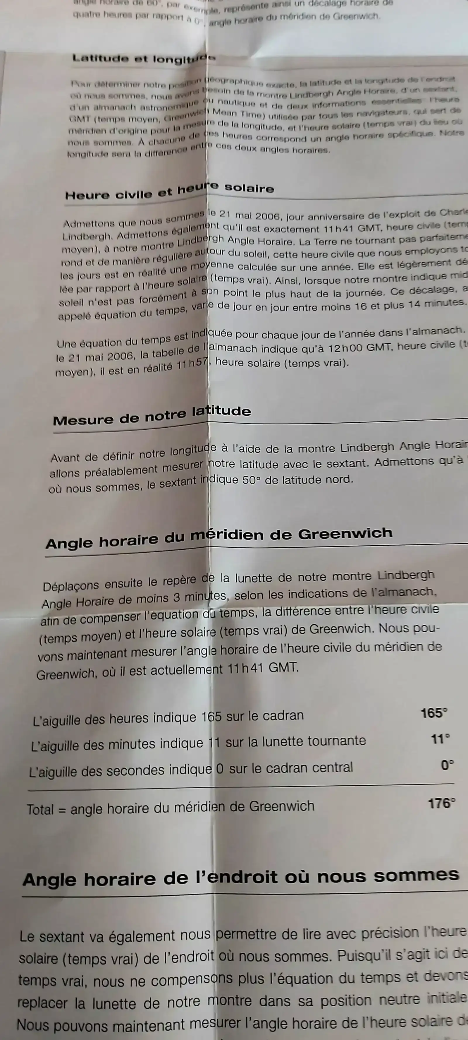 Longitud, Latitud y ángulo horario de Meridiano de Greenwich. de vuelo, es un sextante de vuelo diseñado por Lindberg para su reloj que fabricó Longines en su primer vuelo de 20 Mayo de 1.927. sin escalas Nueva- York a Paris atravesando el atlántico Norte y entrando en Europa a través de Irlanda Cherburgo (Francia) para aterrizar en Paris el 21 de Mayo de 1.927. Todo un hito de la aviación.Curioso reloj, del que no tengo ni idea qué datos da, aparte de la hora. Llamativo.