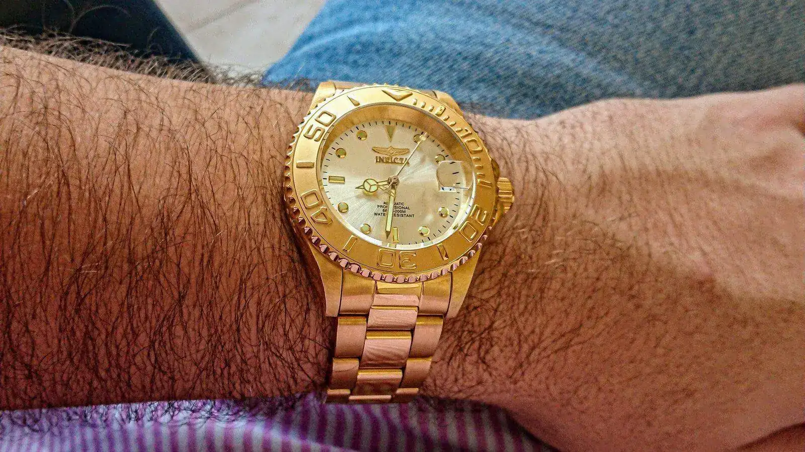 Recuerdo decir qué quería un reloj "güeno" para homenajear a mis abuelos e incluso grabar sus iniciales (GRACIAS POR HACERME DESISTIR DE ESTO, DE VERDAD) y al final acepté qué el reloj era un capricho y qué no me iba a recordar a nadie. Salió por el mismo motivo qué entro: demasiado dorado y llamativo. Y encima diver. Vaya tela. Aquí el Invicta 9010OB: