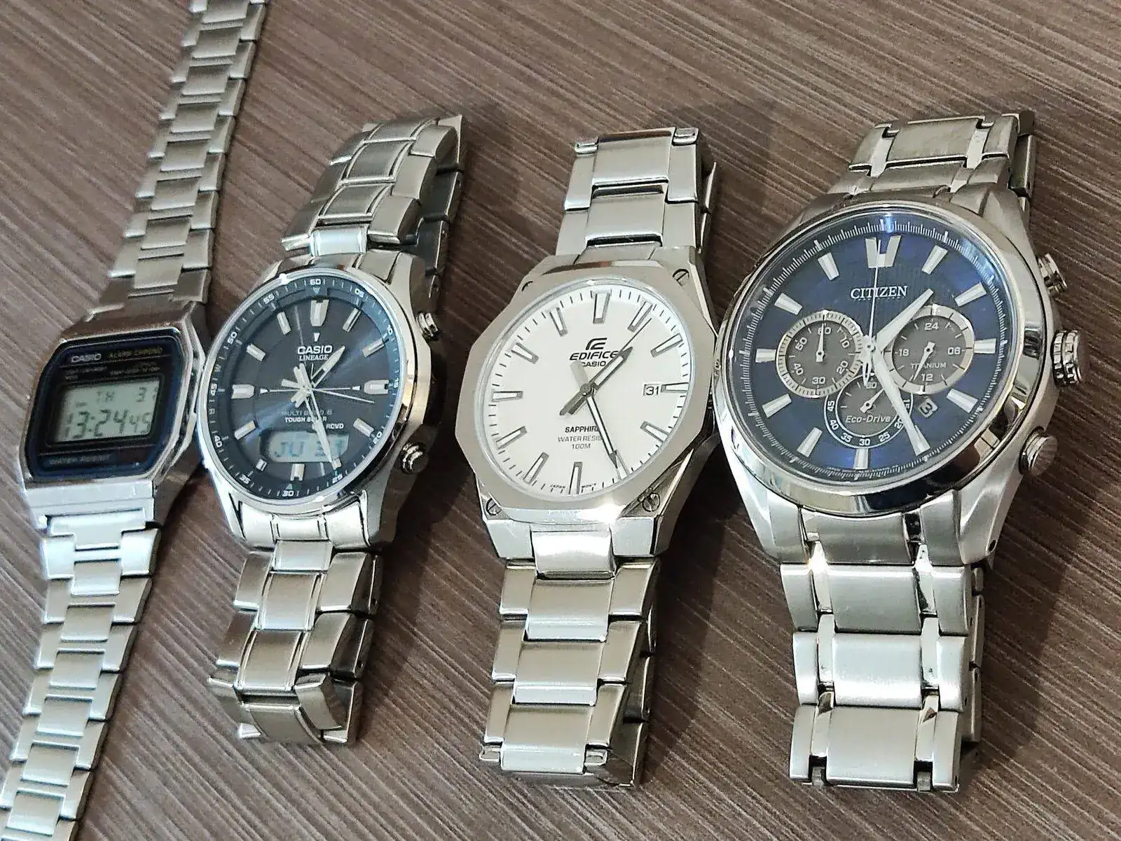 Y ahora ya os muestro una foto de los que forman mi caja actual: un cuarteto de japoneses. Empezar a forear por aquí me hizo rechazar por completo los relojes de cuarzo pero con el tiempo me han vuelto a enamorar y he vuelto a apreciar sus cualidades. Ojo, yo también echo de menos ver la tratadora deslizarse por la esfera, pero ya llegará algún mecánico. Ahora prefiero qué cumplan otros parámetros y el movimiento es lo que tuve qué sacrificar para qué me diese el presupuesto. Lo que tenía claro es que quería armis (ya que he intentado llevar decenas de correas y siempre vuelvo al brazalete), cristal de zafiro y tres colores de esfera: blanco, negro y azul.