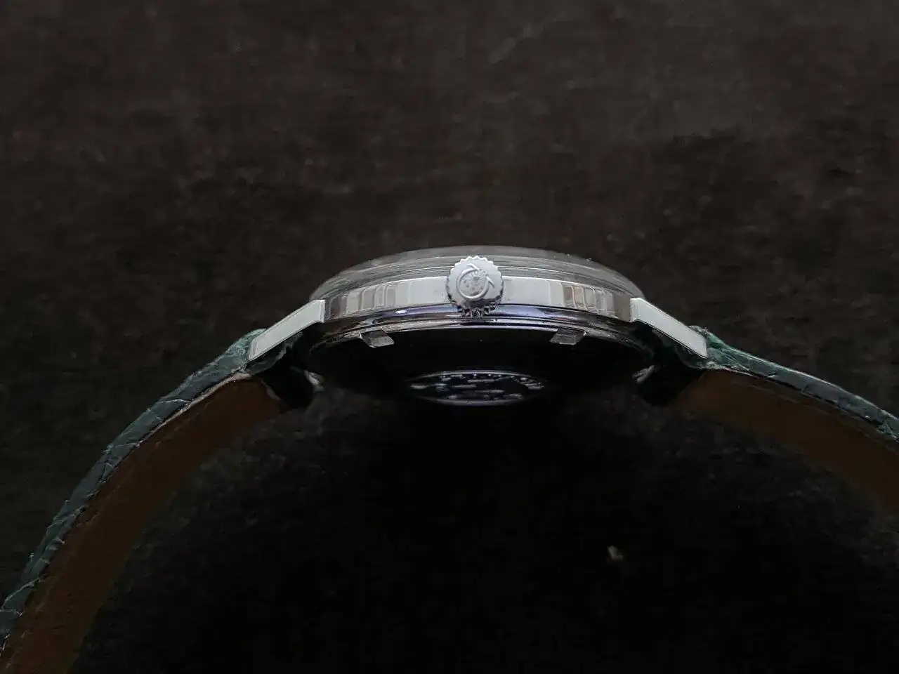 La corona, a las tres, estriada, lleva el logo de Omega. Le he puesto una correa Hirsch Genuine Croco, de color verde oscuro, y he añadido una hebilla Omega, no sé si de la época o anterior.