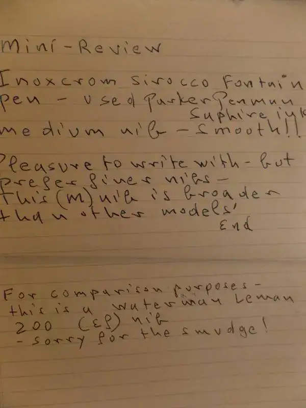 Usando Tinta Parker Penman Sapphire, buen flujo de tinta, buena presencia, el diametro de esta pluma parece mayor a otras sirocco, tendre que buscar forma de medir exactamente. Si alguien quiere, puedo poner fotos comparandolas con otras plumas que uso como Waterman Leman 200 y 100