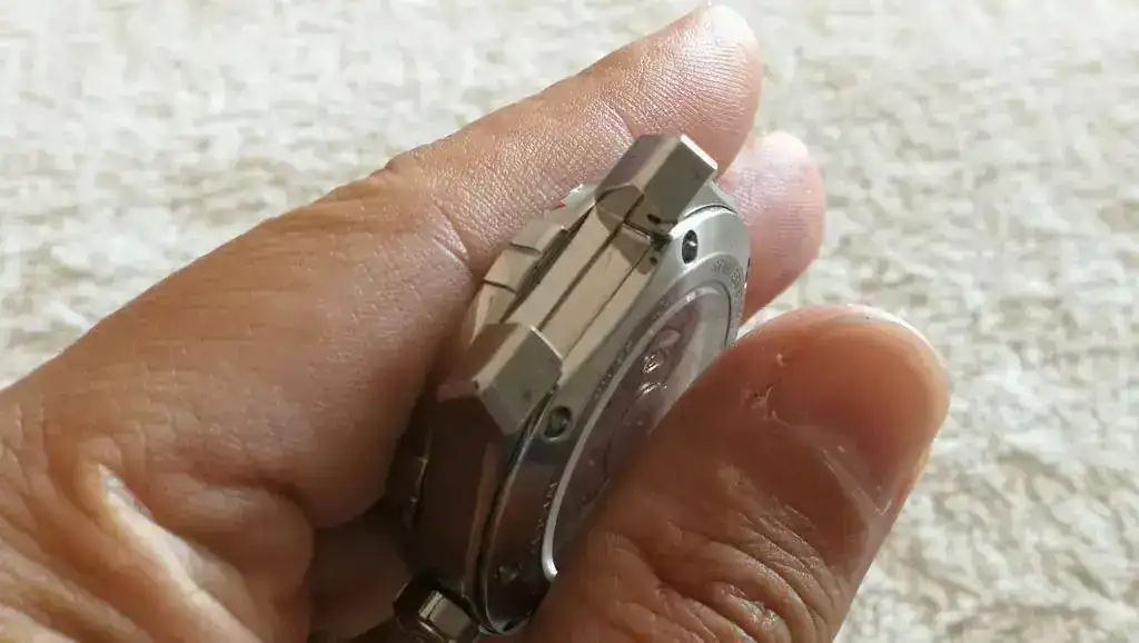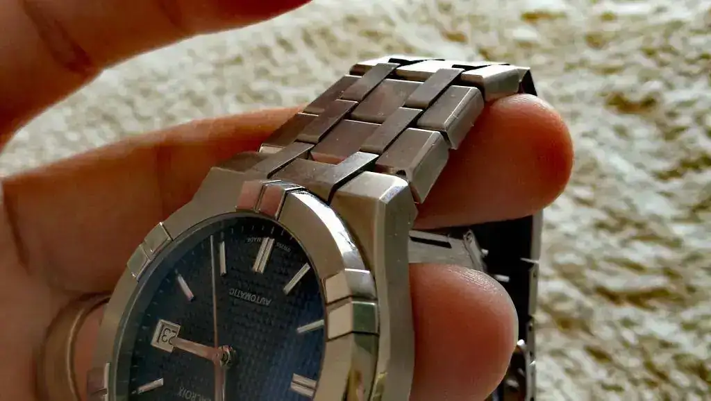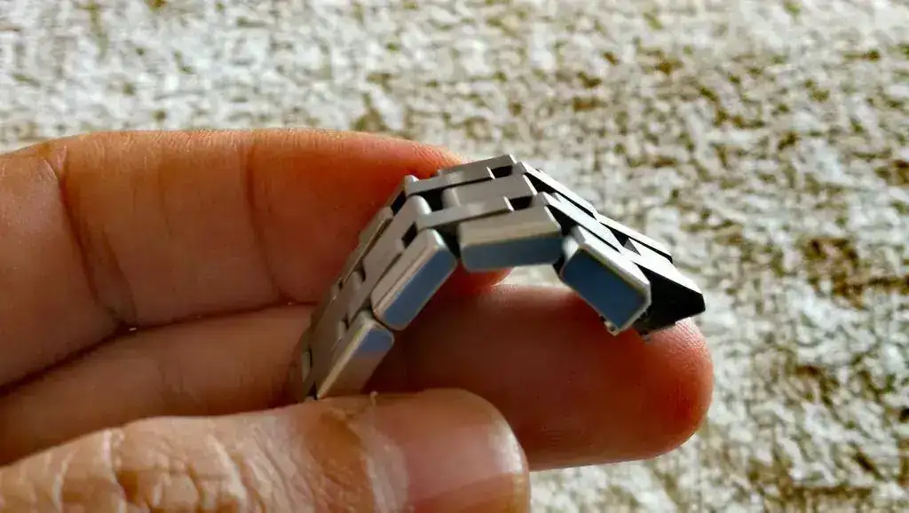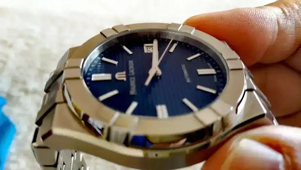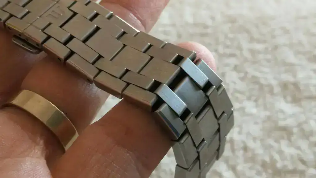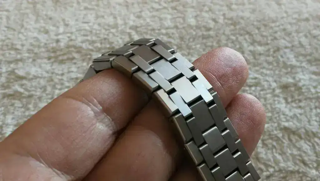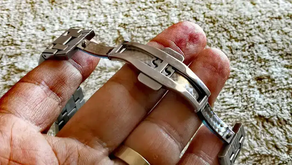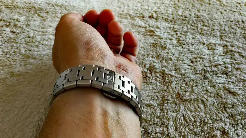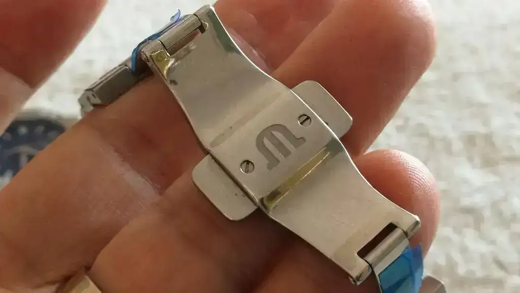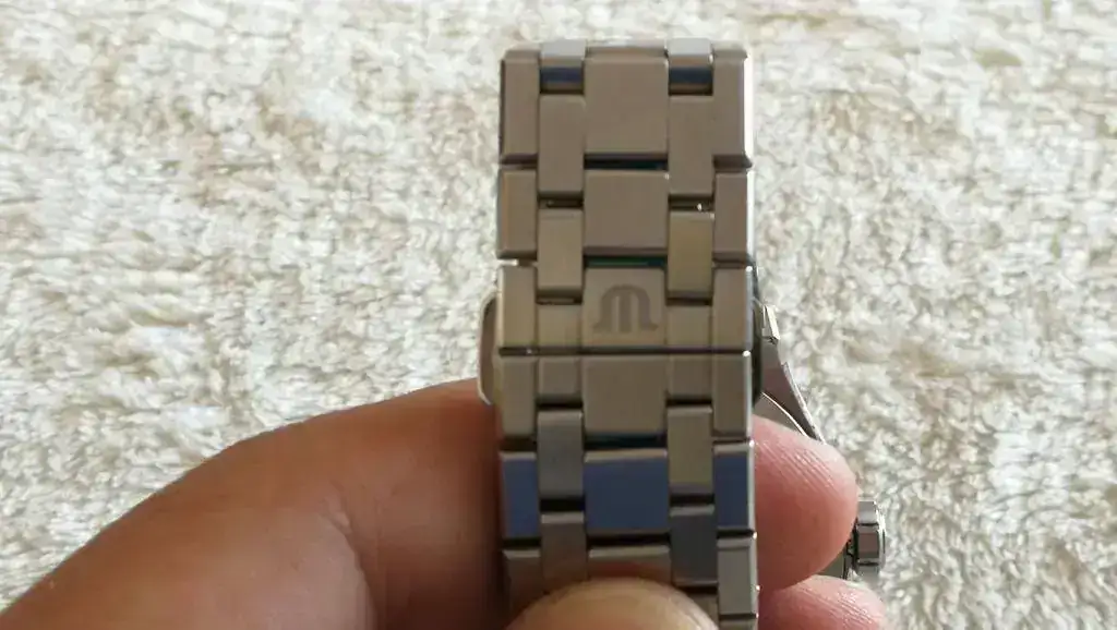 Es muy cómodo y se adapta perfectamente a la muñeca. Cada eslabón cuenta con cinco piezas que están cepilladas exceptuando los extremos que tiene el biselado mencionado anteriormente. Además cuentan con un sistema para desmontar el brazalete llamado Easy clic por Maurice Lacroix, y que consiste en dos pequeños pins que se aprietan para separar el brazalete de la caja.