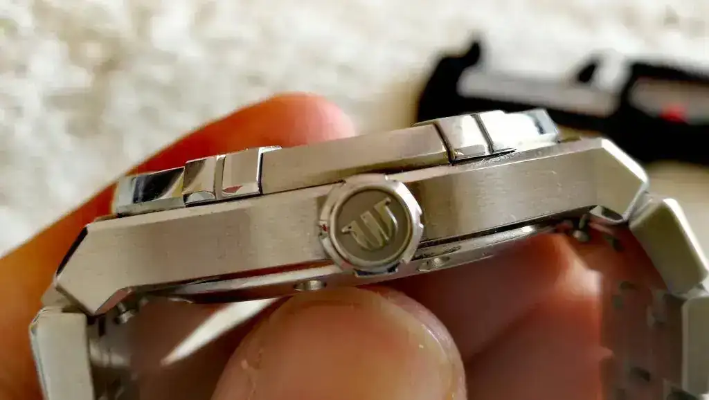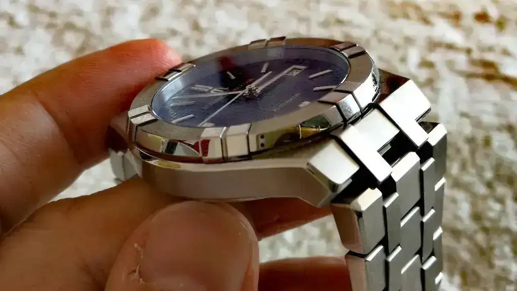Maurice Lacroix fabrica sus propias cajas, y de hecho fabrica para otras marcas (según tengo entendido), por lo que la atención al detalle en el mecanizado tanto de la caja como del brazalete son de un nivel de acorde a su precio, y diría que un poco más. Tiene un aspecto masivo como corresponde a todos los relojes que llevan el brazalete integrado.