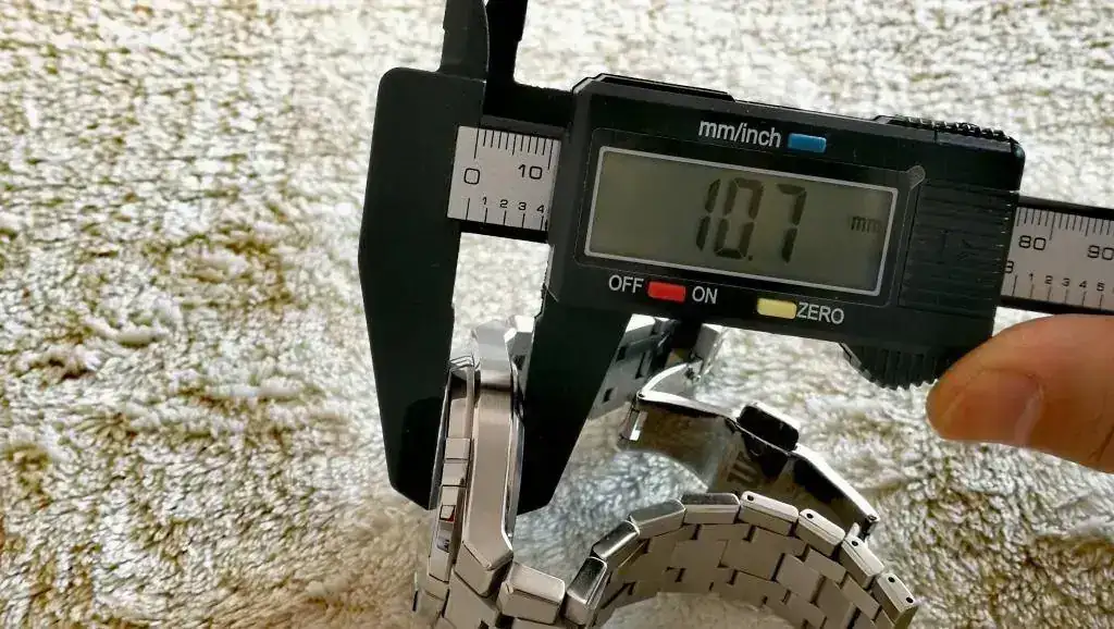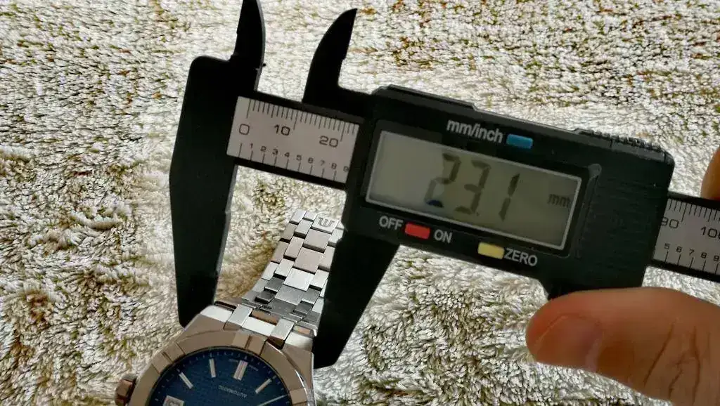 El ancho del brazalete en la unión con la caja es de 23mm hasta los 19mm en el cierre.