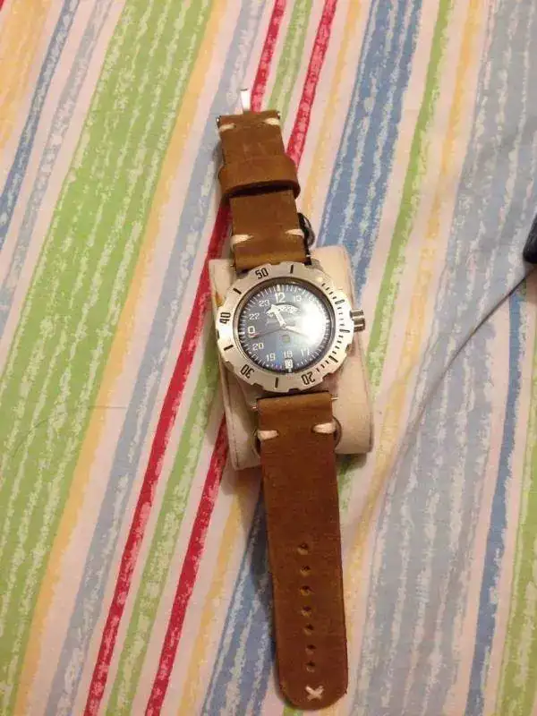 Por ahora asi luce la caja. La correa del Vostok es provisional en lo que encuantro una de cuero de tono cafe mas obscuro.