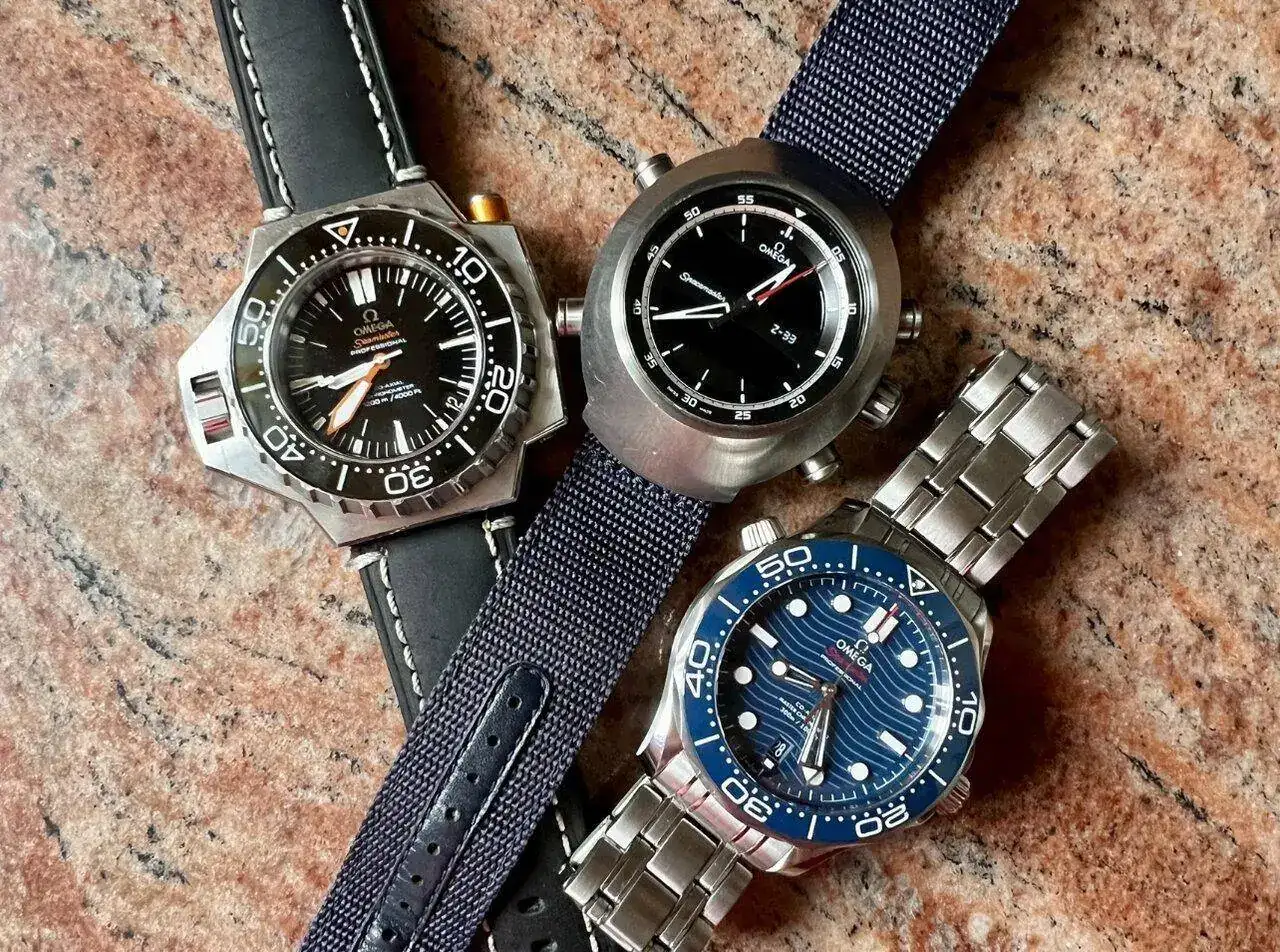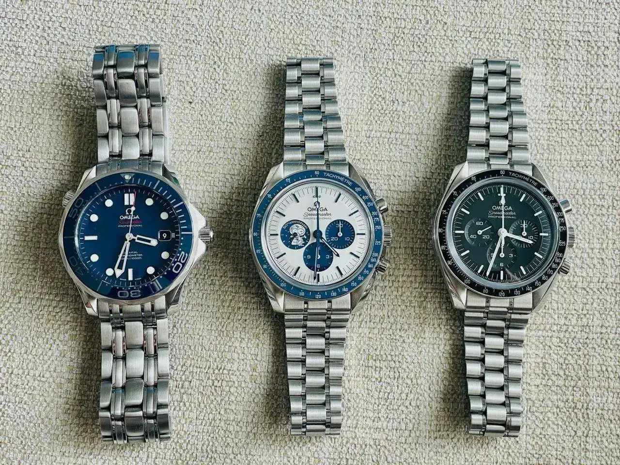Empezando por la izquierda tenemos a un Seamaster Pro 300 cerámico ‘sin olitas’ azul.