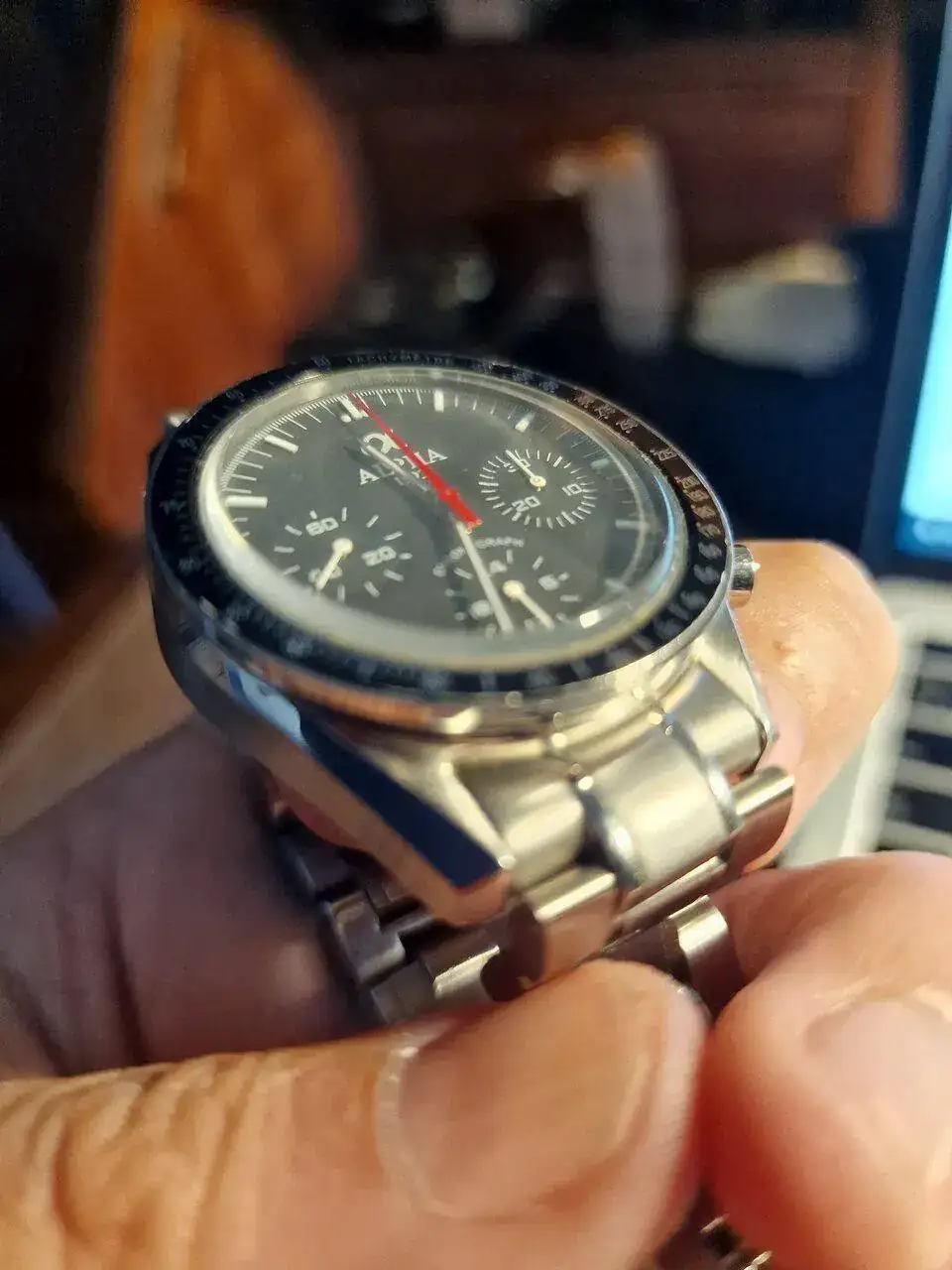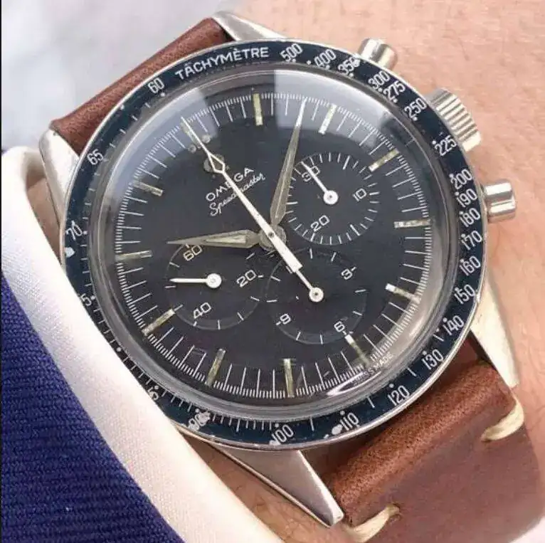 - bisel taquimetrico, con detalles para aficionados como el DON, dot-over-ninety (editado) que lleva el modelo actual de Omega y los antiguos Speedys.