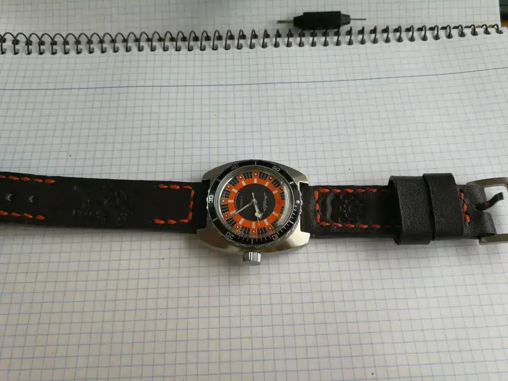 Y por si fuera poco, como me piqué al hacer la correa para el Komandirskie classic del camarada @cestommek, pués me he pillado, no uno, sino dos doraditos... :ouch: y he preparado una correa para uno y los voy a poner en venta seguramente: