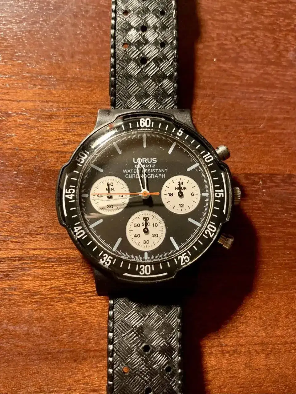 Un Lorus. 8 euros me ha costado, y me lo ha enviado un italiano en estado NOS. Poco se le puede pedir por el precio. Le he puesto, eso sí, una tropic de los 60 que le queda genial.