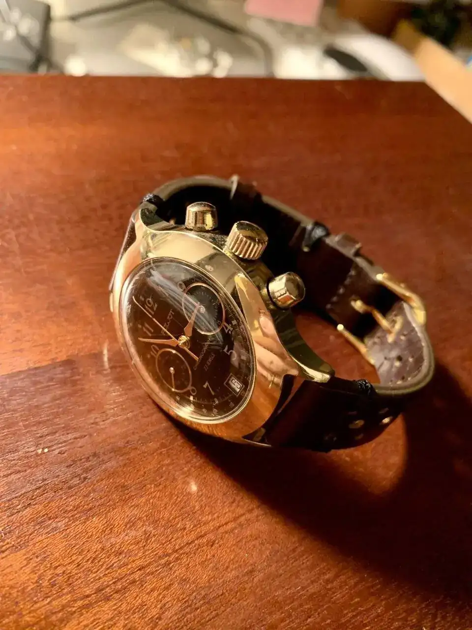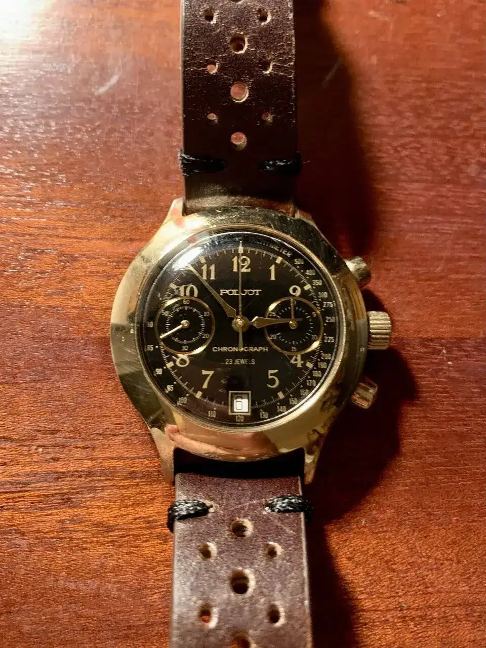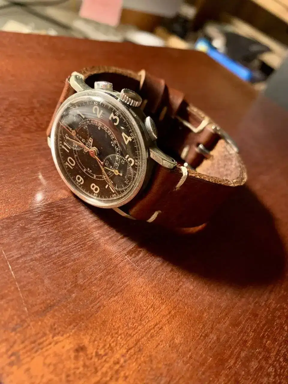 Curiosidad: mi relojero (un crack ya jubilado) es tercera generación de relojeros. Pues bien. Este reloj le apareció en un cajón, desmontado. Tenía una nota que decía que el reloj había sido entregado roto al padre de mi relojero a cambio de un Seiko de cuarzo. El padre de mi relojero lo desmontaría, pasó de arreglarlo y lo metió todo en una caja y lo guardó en un cajón.