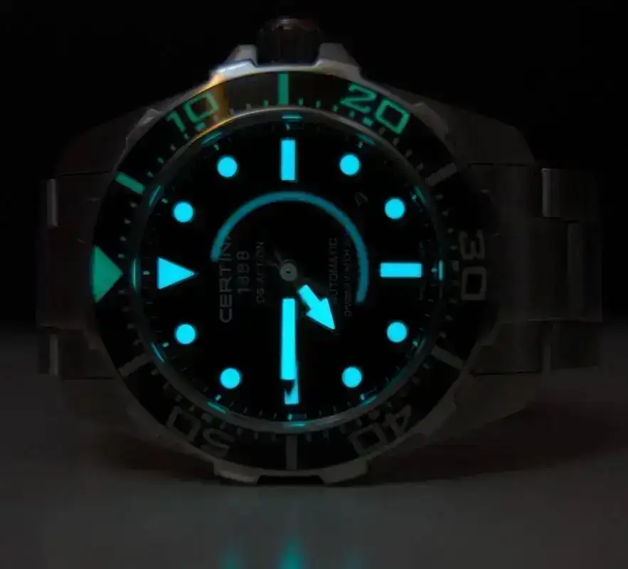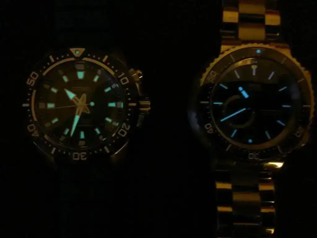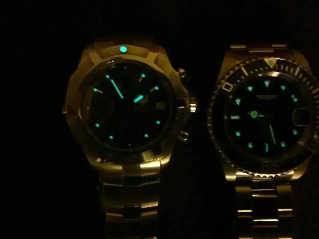 Al igual que las ciudades tienen un atractivo especial por la noche, nuestros relojes también tienen su encanto, en mi opinión. Os dejo unas malas fotos hechas con el móvil de mis 4 divers: Seiko Sportura kinetic, Oris Titan C SS, TAG 2000 e Invicta Prodiver 8926. Espero que pese a su dudosa calidad (al Invicta le he quitado un trocito) os gusten.