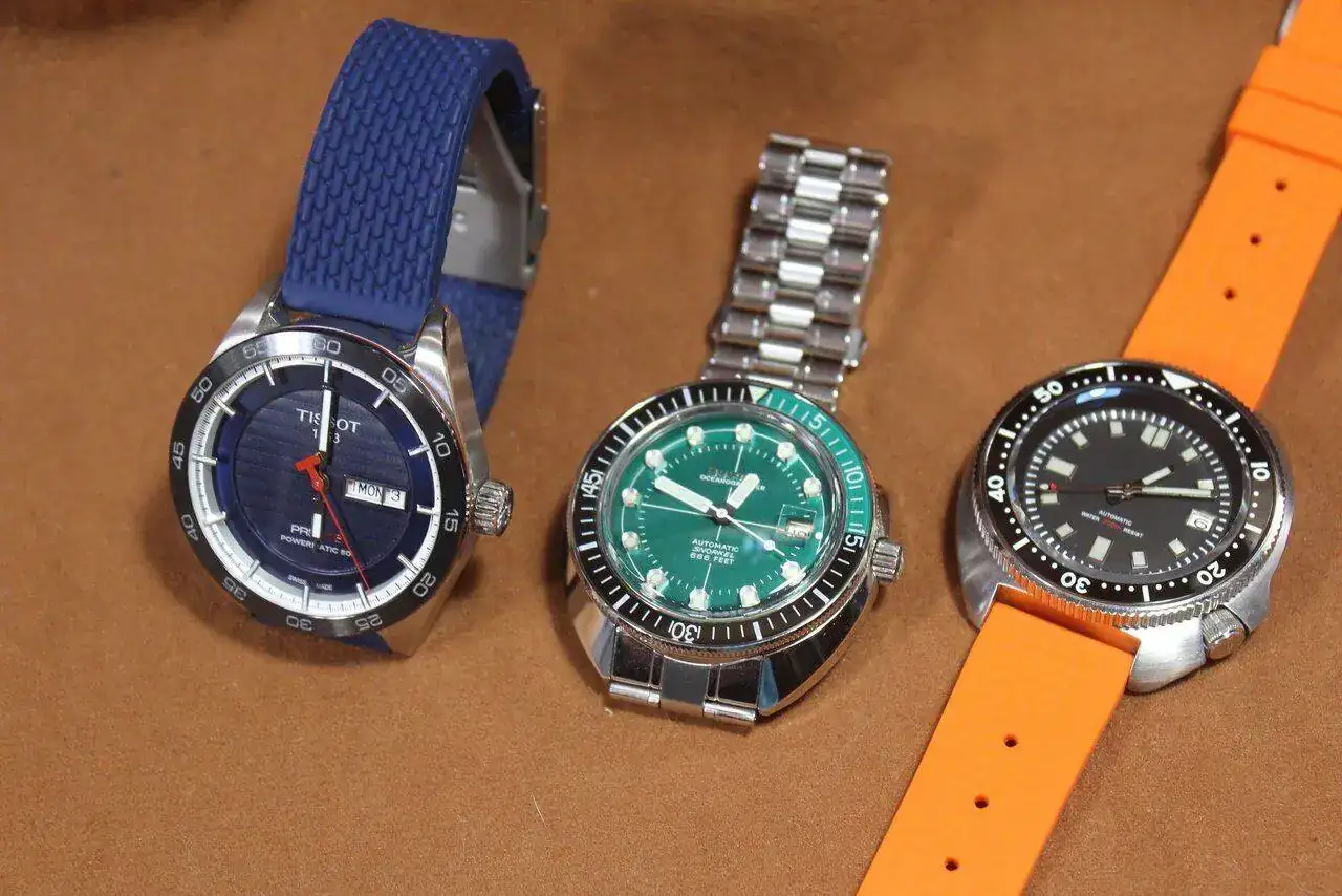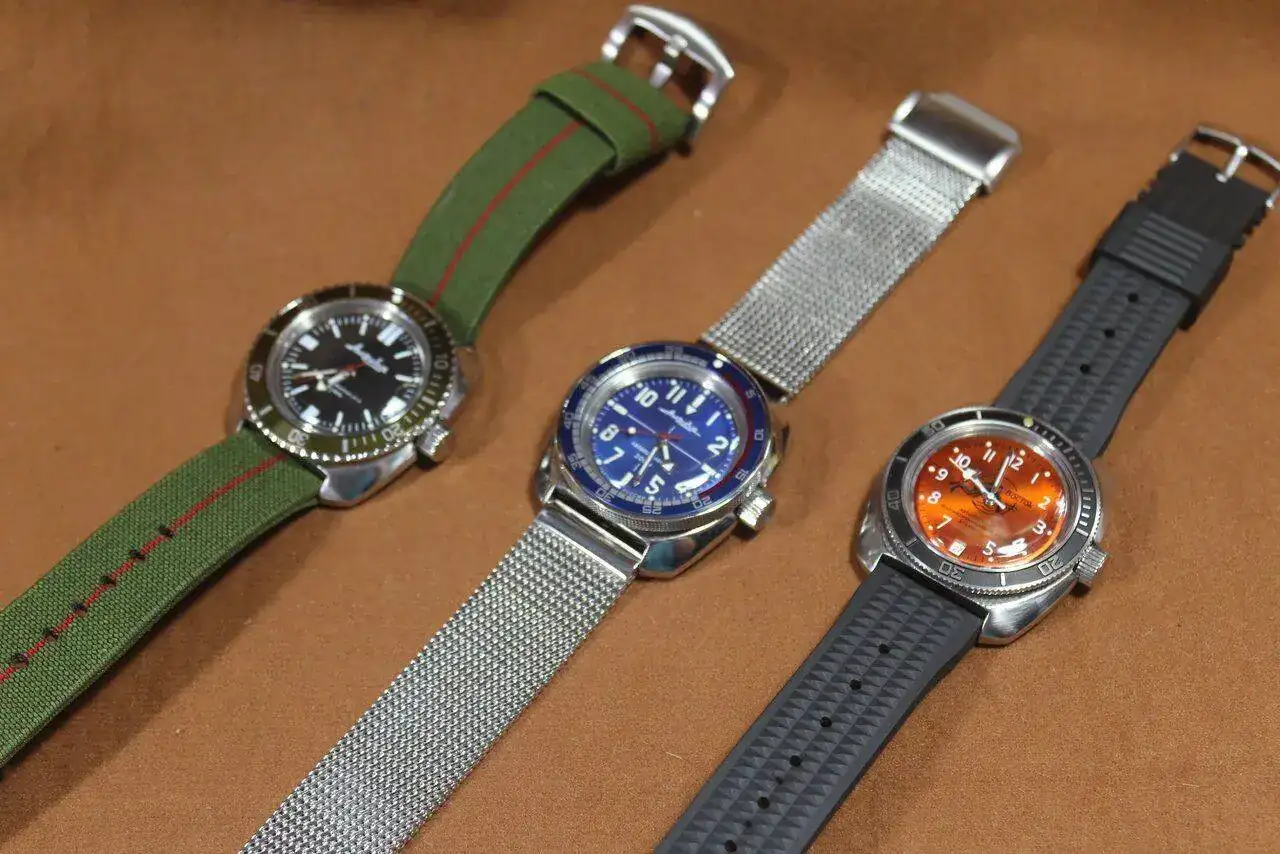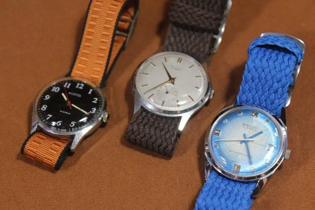 Abren el desfile, un Enicar de remonte manual, un Raketa "doce rojo", y un Steelco tambien de remonte manual.