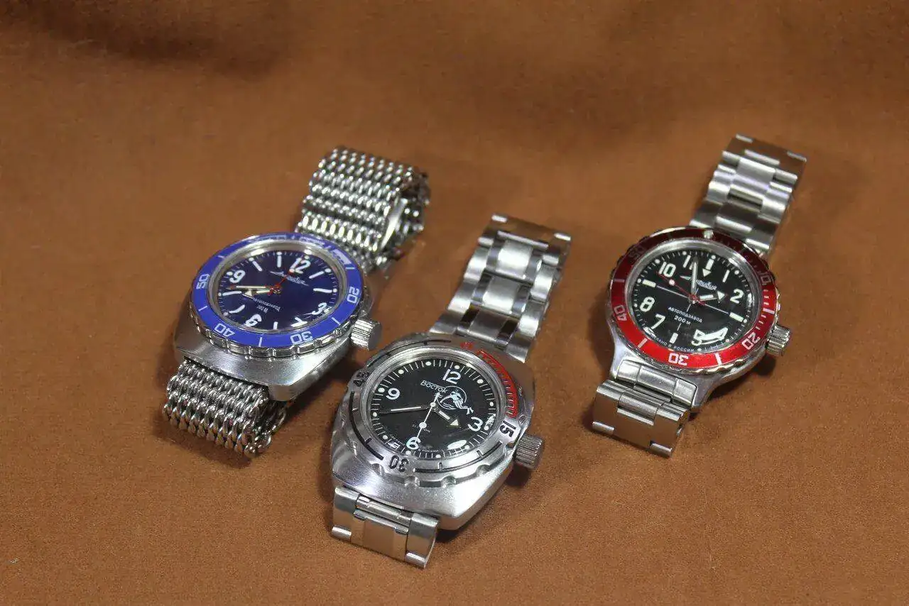Despues, casi para finalizar, tres rusos, dos Komandirskye "brasseados" y un Vostok antimagnetico, al que , en un arranque de locura, decidi "bañar" el bisel cromado en acido para remover el cromado original, hecho que ahora lamento, pero, eran los tiempos en que estaba experimentando con el baño de acido para todo, por suerte esos tiempos han pasado, o al menos el fervor por el acido ha menguado.