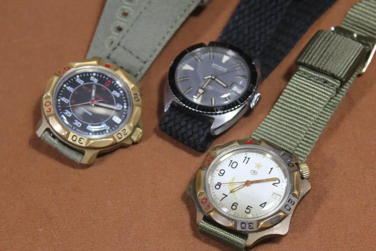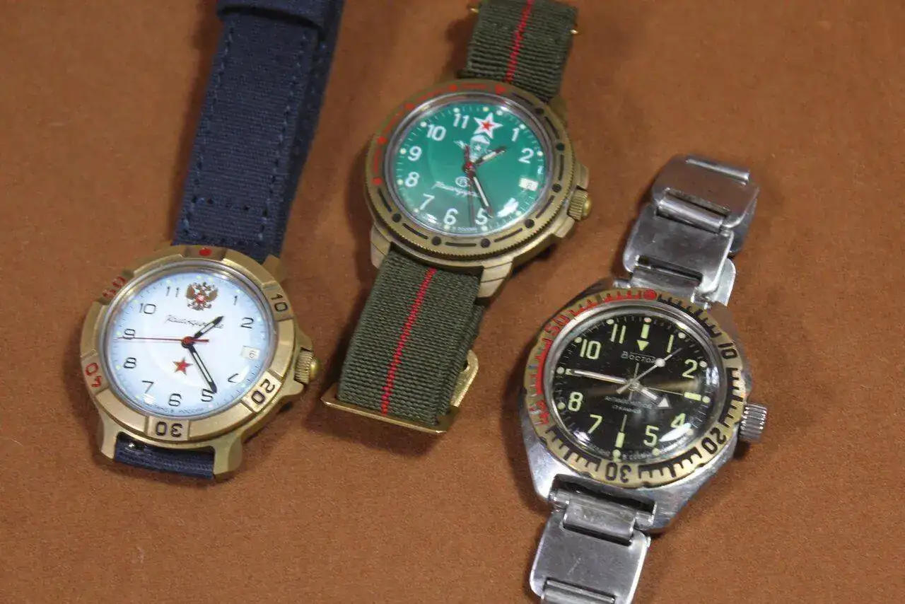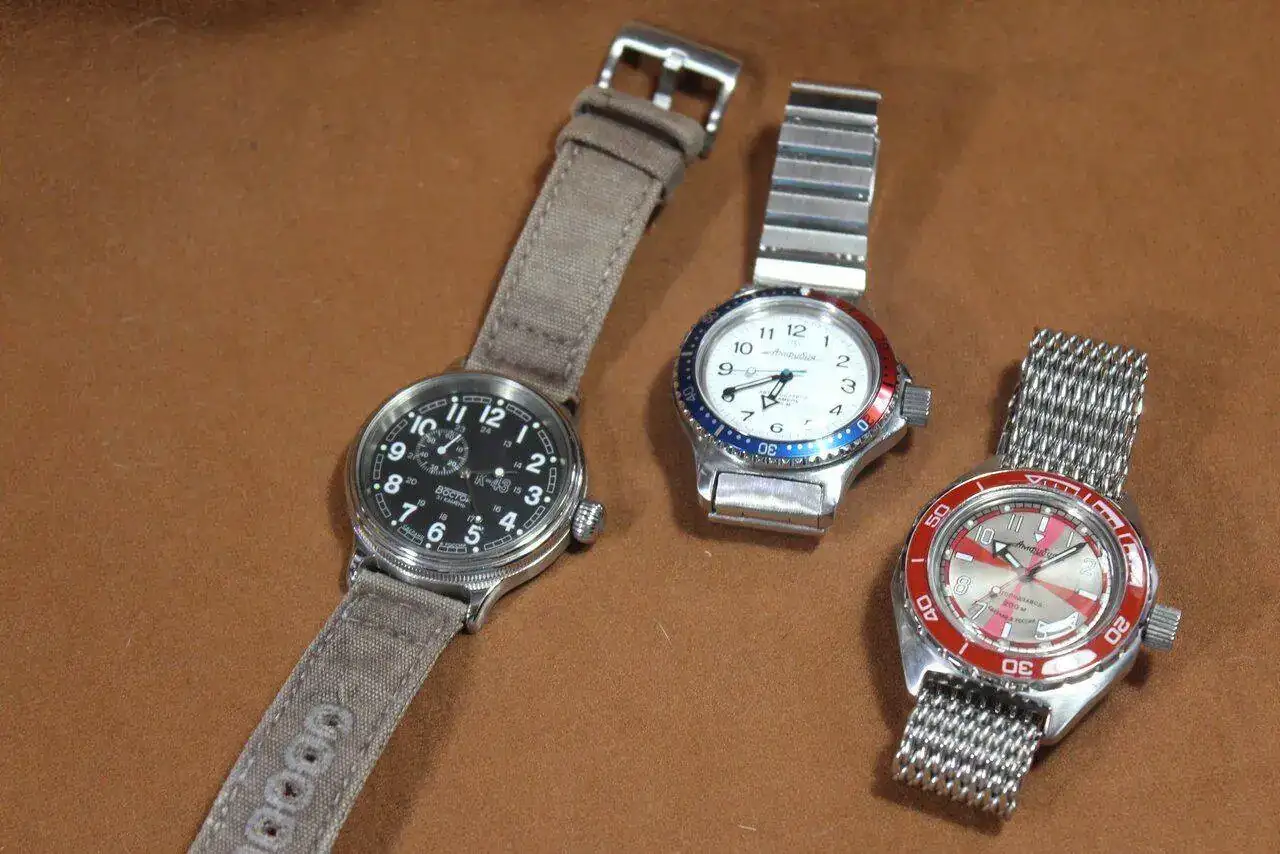 Otros rusos, esta vez dos cajas 090 y una 420, el reloj del medio, hace poco le puse su dotacion original y me encanto la idea, le apodé el "ruso de sangre pura"