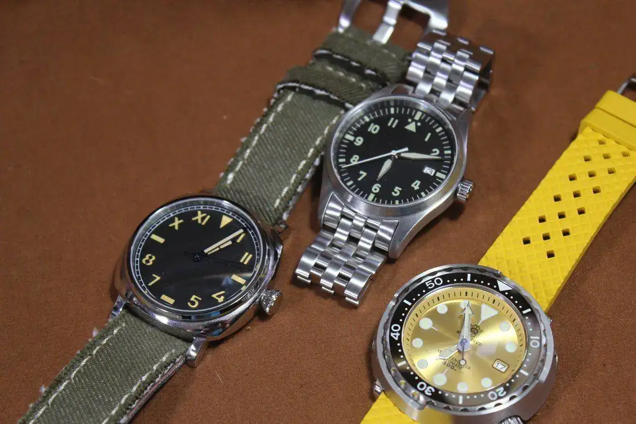 Cierran la marcha otros tres chinos, un Bliger, recientemente adquirido (tenia ganas de hacerme con un reloj con el dial california), con clara inspiracion al Panerai, un Addiesdive y un Tuna amarillo, igualmente, encantado con estos tres.