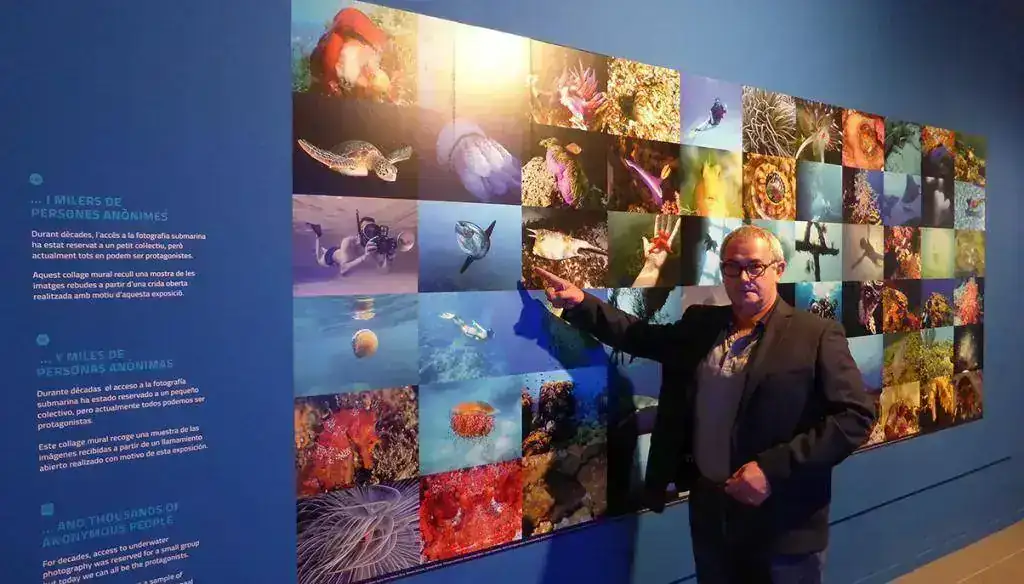 El pasado verano,el Museo Marítimo de Barcelona hizo una convocatoria pidiendo un par de fotografías submarinas por participante, con la idea de confeccionar un mural colaborativo con las mejores fotos recibidas, que exhibiría en la exposición “Cámaras submarinas. El reto de fotografiar bajo el agua”