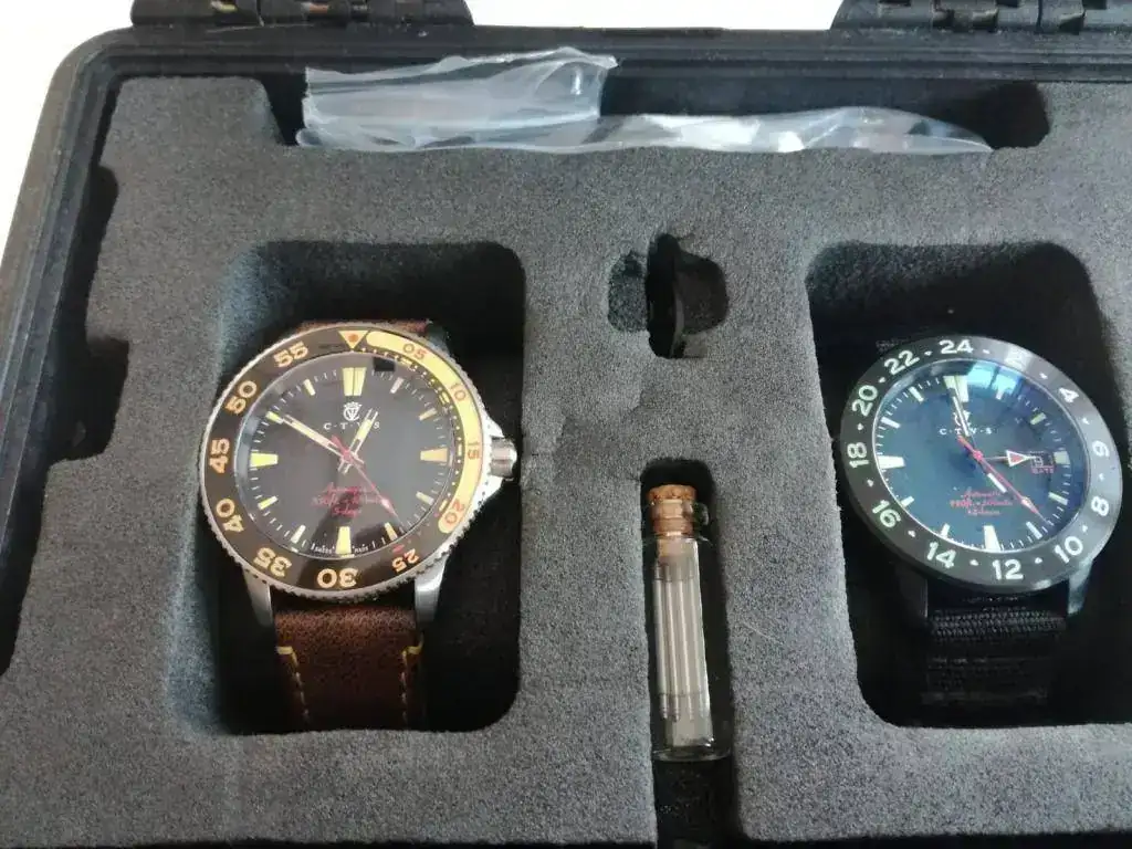 Ambos comparten la misma caja ,la caja trasera va fijada firmemente con seis tornillos ,la de alpha tiene un zafiro serigrafiado el logo en su parte interna con superluminova a juego con la esfera ,ambos tienen proteccion antimagnetica.. Modelo alpha sumergible 100 metros,como dije antes monta un calibre tt718 un refinado movimiento de carga manual y doble barrilete con reserva de marcha de 5 dias,....el beta con un bisel 24 horas y sumergible 300 metros,lo mueve un 2839-2.