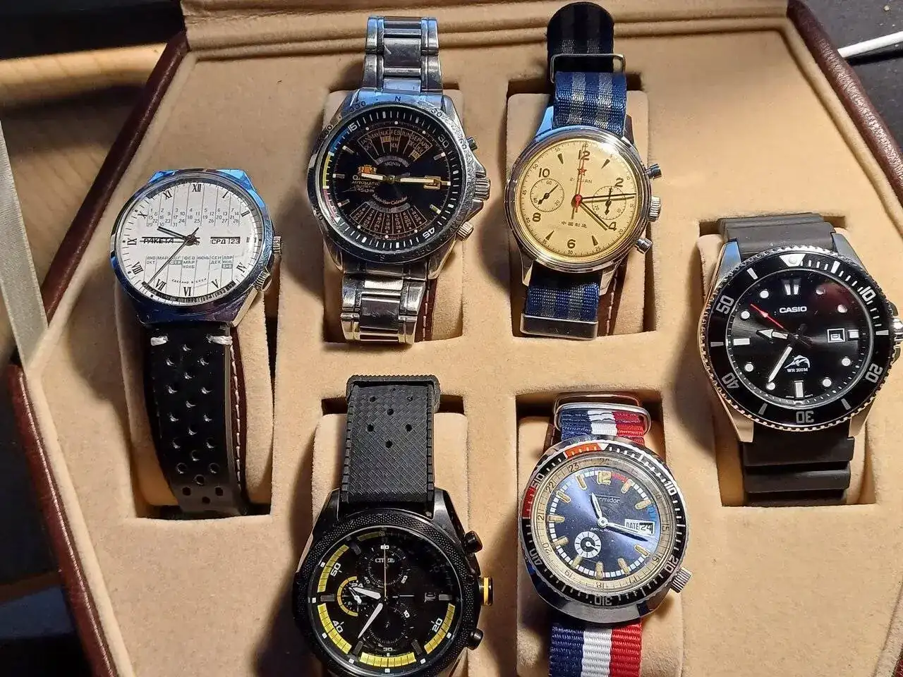 La caja con los intangibles, la caja con mis Seikos, mi marca preferida, y las dos ultimas entradas un PADi y Un Bulova Pilot Lunar, del que estoy enamorado, y el Oriente que me regalaron mis hijos en mi Jubilación