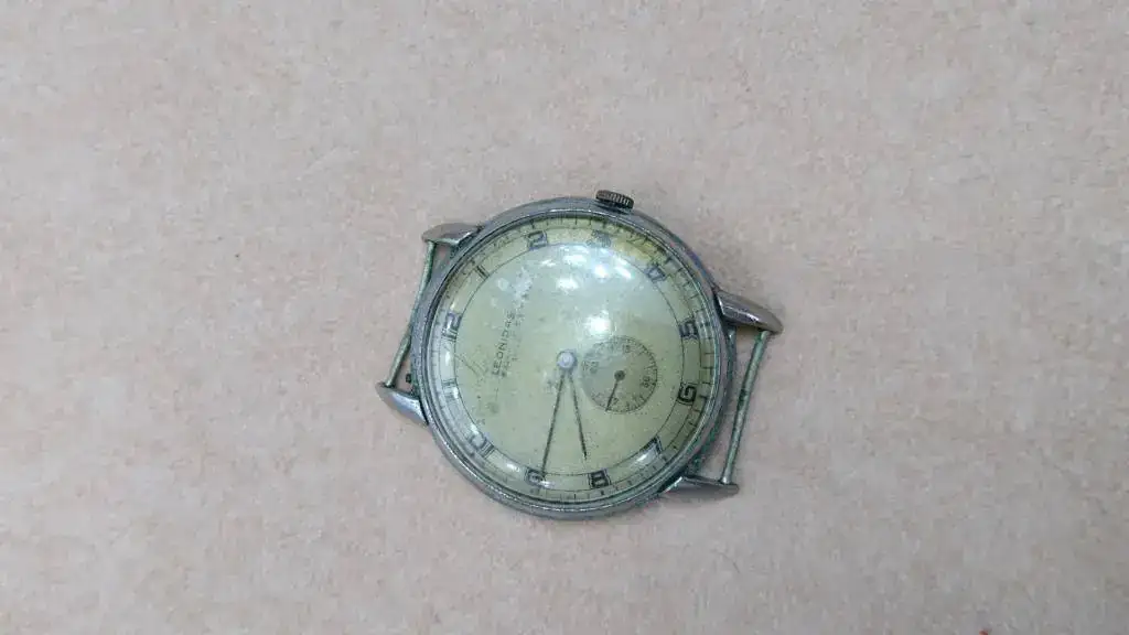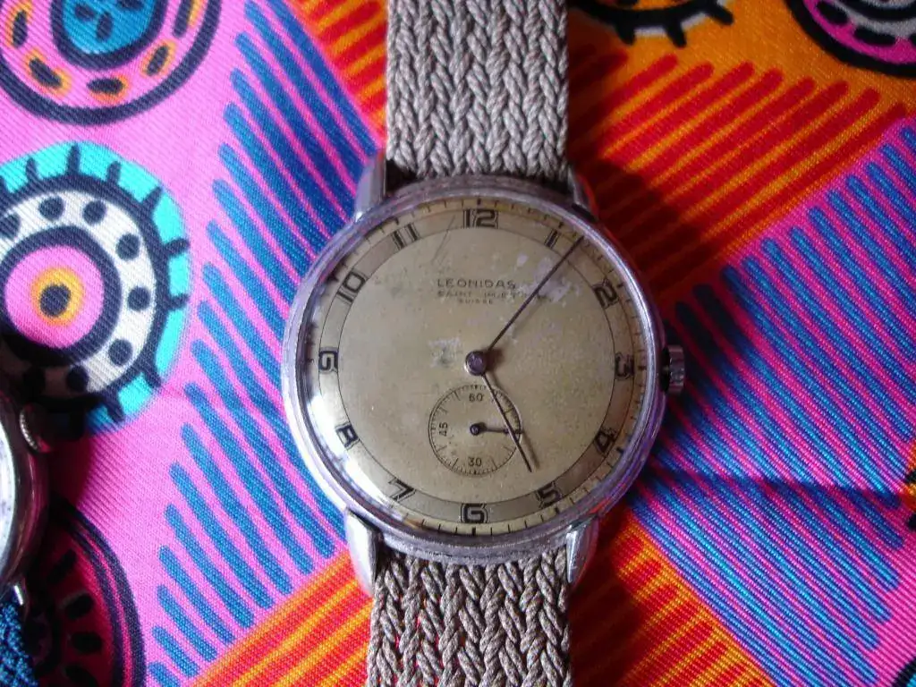 ) y me habían entusiasmado esos mismos detalles de su calibre, así que me fui de cabeza a agarrar a aquel pobre desnudito para verle la cara, et voilà: un Leonidas, muy castigado y maltratado por el tiempo y el poco cuidado, pero muy atractivo a mis ojos. Todo esto con vívidas expresiones de asombro, emoción y alegría por mi parte, que tenían perplejo a mi relojero (ya os he dicho muchas veces que es muy buen profesional, pero no tiene para nada nuestra pasión por las resucitaciones de estos viejitos). Toda contenta le pregunté si le importaba cedérmelo para intentar que alguno de mis queridos compis artistas tratara de devolverlo a la vida; si resucitaba, era cuestión de ponerle un plexi de tapa para protegerlo, como ya nos ha mostrado en alguna ocasión Casiná. Me miró como si estuviera loca y me lo separó; de pronto se pone a revolver en la fiambrera y resulta que aparece su tapa (sí, hace falta delito para tenerlo destapado rozando con toda la chatarra, sabiendo que tiene su tapa, pero bueno