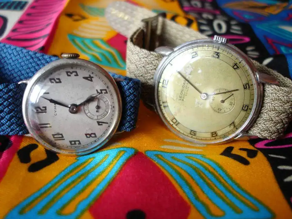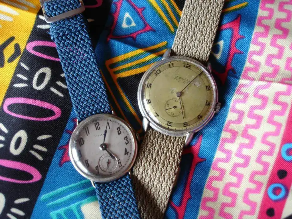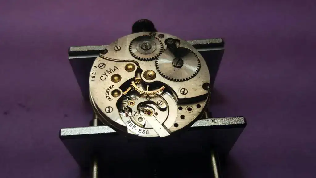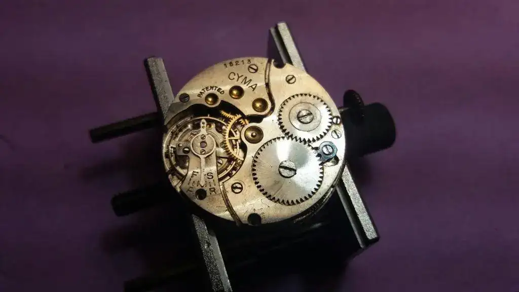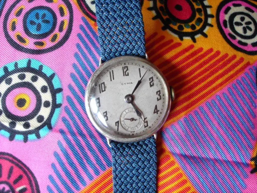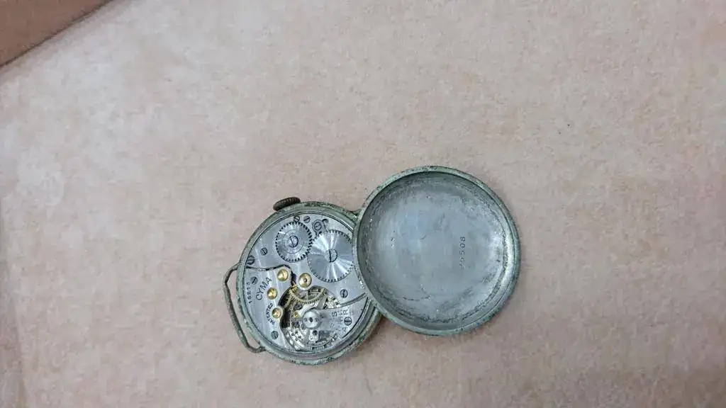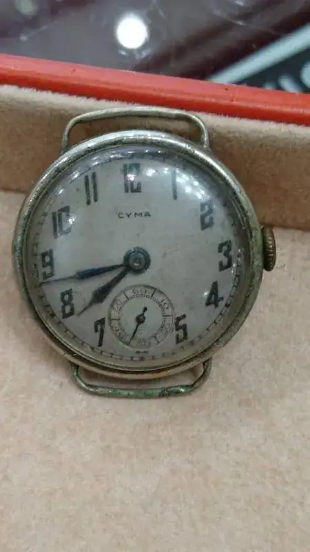 ¡Y eso no es todo! Mientras revolvía para localizar la tapa, asomó entre todo el revoltijo un relojito de transición al que automáticamente me lancé antes de que volviera a quedar sepultado, y resultó ser un encantador Cyma. Estaba cerrado y completo, pero tampoco funcionaba. Le dije que también me interesaba, y que me hiciera por favor un lote apañadete con ambos
