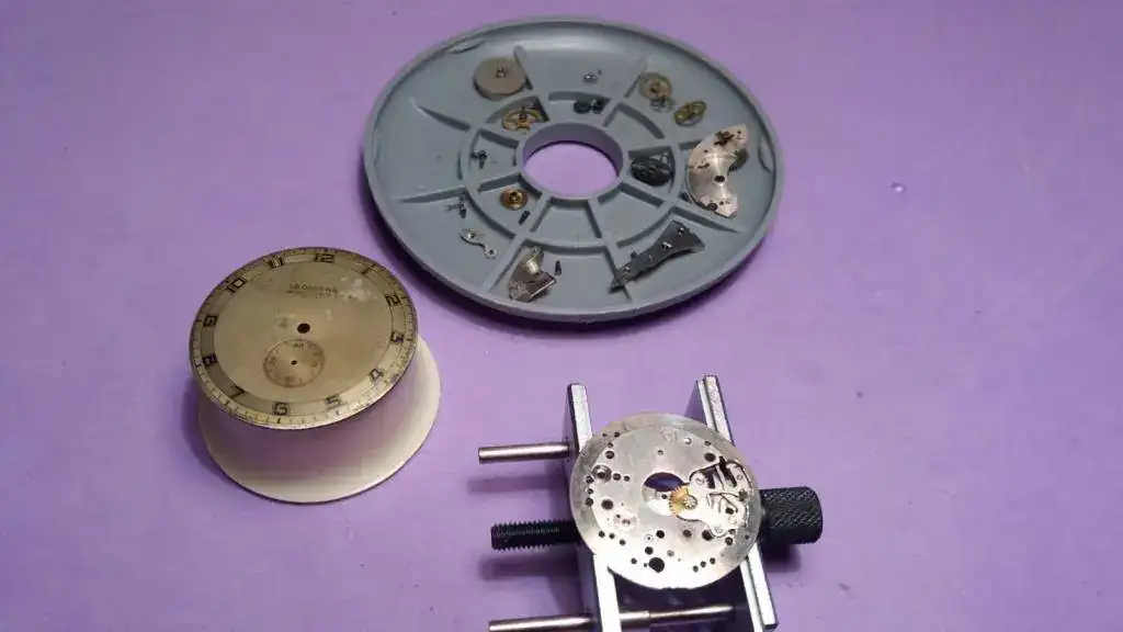 Lógicamente me acerqué emocionadísima a fisgar lo que había en aquel batiburrillo, y lo primero que me salta a la vista es un relojito que estaba boca abajo y con las tripas al descubierto mostrando desinhibidamente unos preciosos puentes rectilíneos y unos chatones cuadrados. Hacía muy poco nuestro murcianico había mostrado su impecable Leonidas (el del 7 con tupé