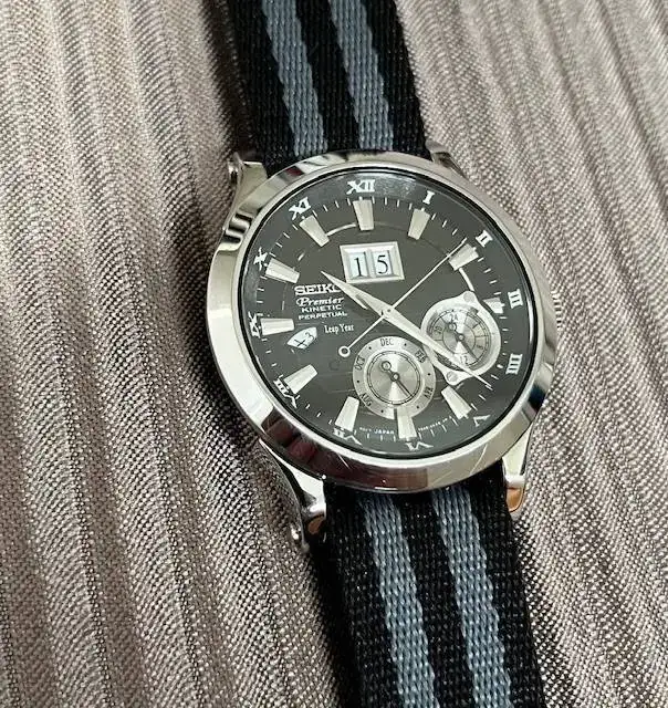 Damos un gran salto temporal hasta el año 2.011, se trata de un SEIKO Kinetic Premier Perpetual Calendar. El reloj que me regaló la mujer que a día de hoy me sigue aguantando (tengo la casi certeza de que me lees en la sombra, así que te doy las gracias por TODO lo que estamos consiguiendo juntos) para el día de nuestra boda. El reloj de origen trae una correa de piel negra con deployante que aún conservo, pero ahora mismo lo tengo con esta nato.
