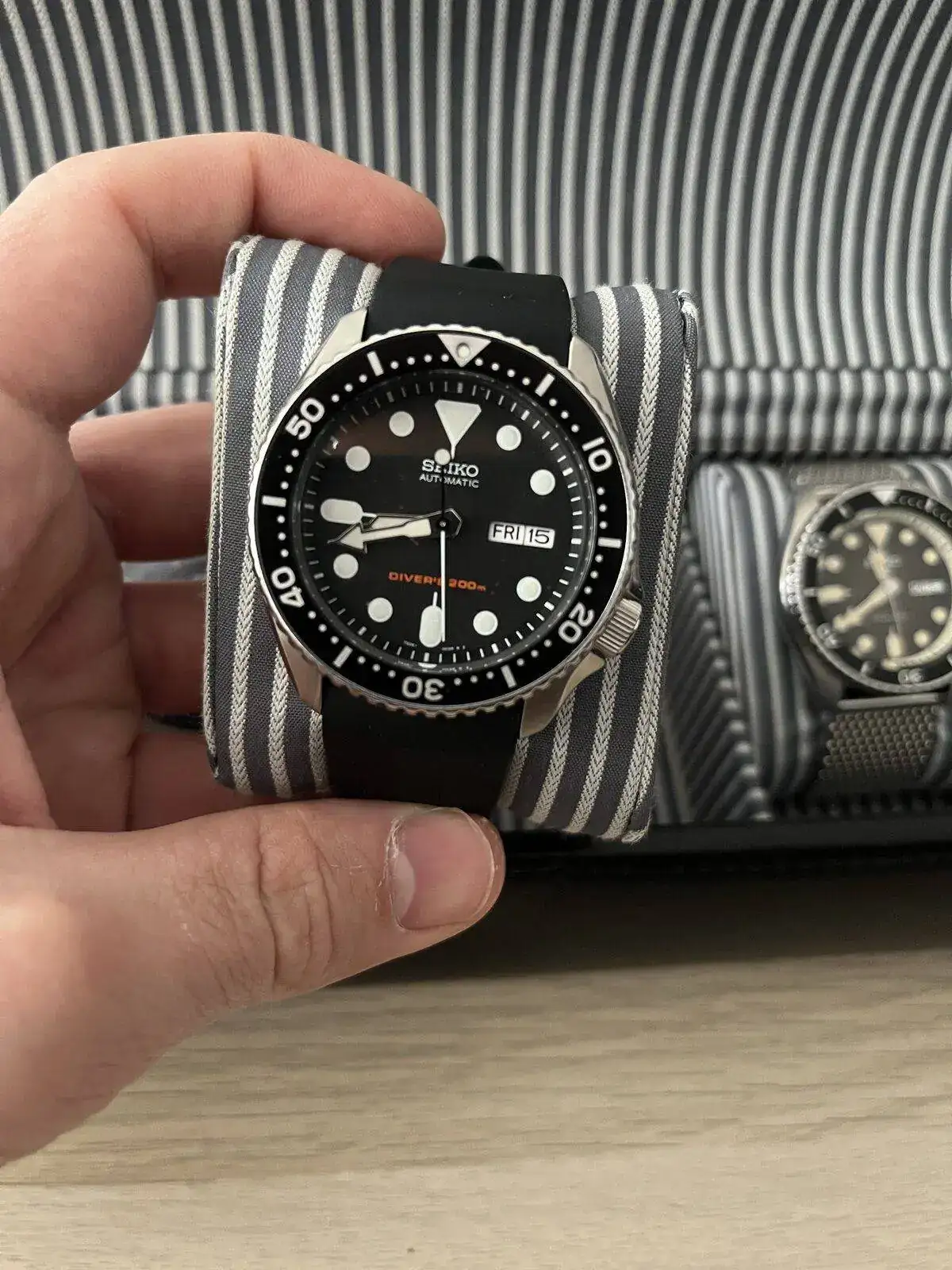 Otro SEIKO 5 SRPD con bisel de buzeo, malla milanesa y una esfera preciosa color café pero solo con 100m de resistencia al agua. Y un último SEIKO, el SKX007, con una correa de caucho muy cómoda.